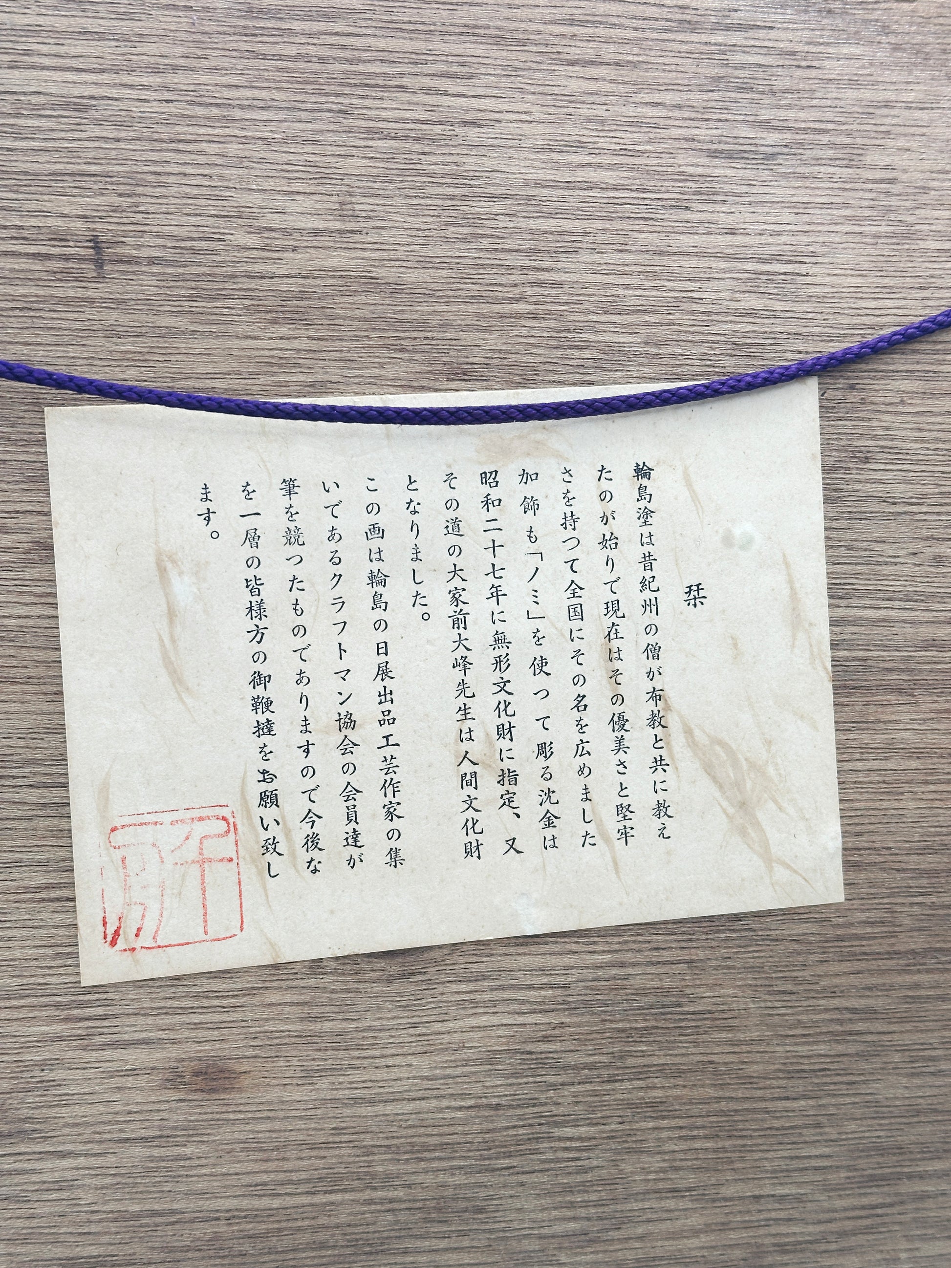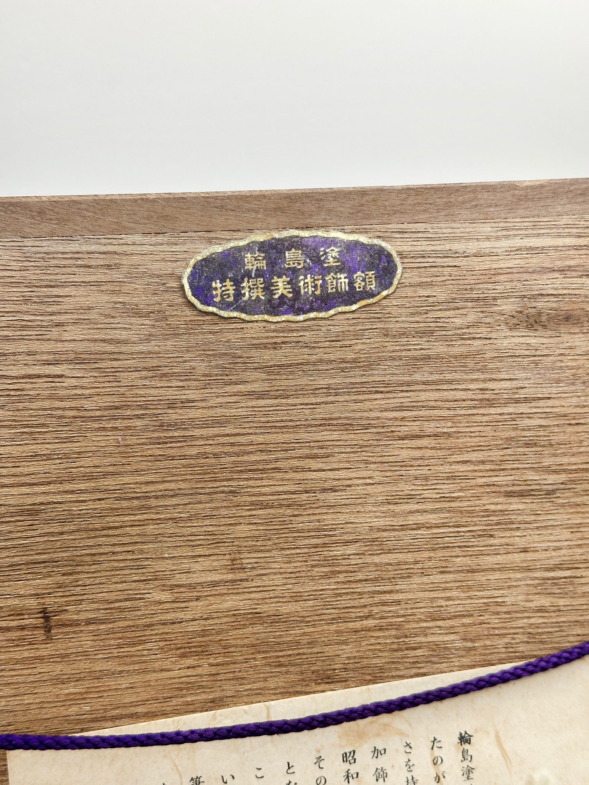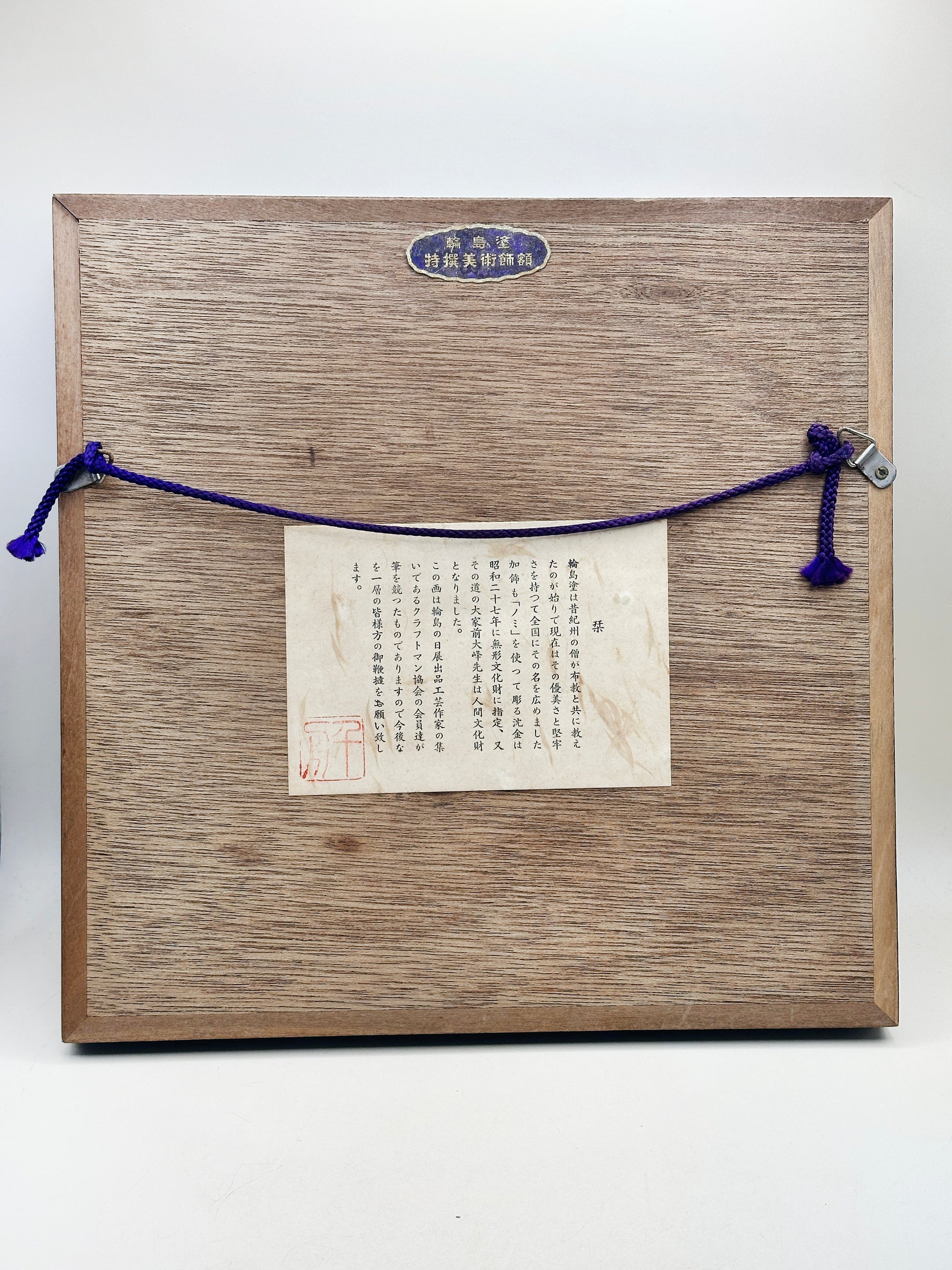The panel is mounted within a textured natural-fabric mat and a dark wooden frame, creating a calm, understated contrast that draws the eye inward. On the reverse, the original paper label explains the history and prestige of Wajima lacquerware: its origins in Buddhist craftsmanship, its use of jinoko (diatomaceous earth) for durability, and its designation in 1952 as an Important Intangible Cultural Property of Japan. The plaque on the frame further identifies the work as by a Wajima-nuri certified master craftsman.