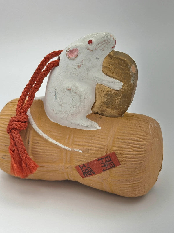 Ornement de cloche en argile japonaise vintage représentant un rat (nezumi) tenant une pièce d'or et assis sur un paquet de paille de riz (komedawara).