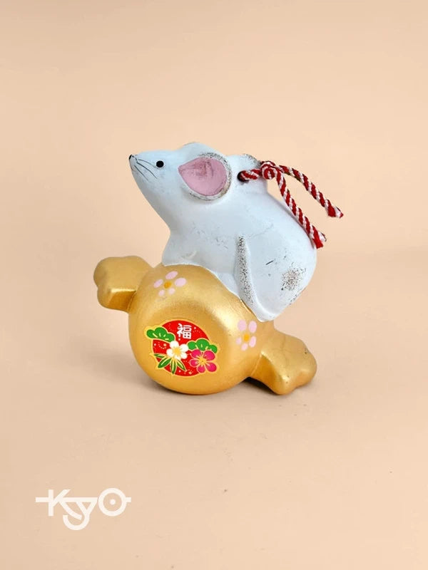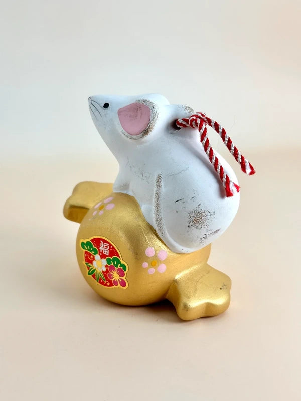 La souris (nezumi) est un animal du zodiaque chinois et japonais, symbole de fertilité, d'intelligence et d'ingéniosité. Associée au maillet porte-bonheur, cette clochette dorei est un talisman de richesse, de succès et de protection. Clochette traditionnelle artisanale en argile ou en céramique, la dorei produit un son doux et agréable lorsqu'on la secoue. Souvent vendue dans les sanctuaires ou lors de festivals, elle est utilisée comme porte-bonheur pour éloigner le mal et attirer la chance. Le son de la cloche est censé purifier l'environnement et attirer les énergies positives.