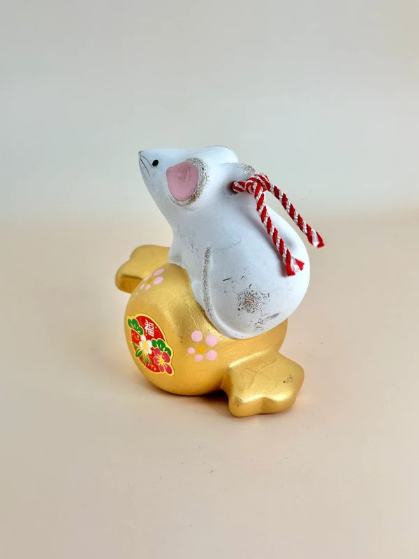 La souris est peinte en blanc doux, avec l'intérieur des oreilles rose, les yeux noirs et de fines moustaches. Elle adopte une pose à la fois ludique et propice, incarnant la vivacité et l'abondance. Le maillet est doré, décoré de motifs floraux et du kanji rouge 福 (fuku), qui signifie bonne fortune ou bénédiction.