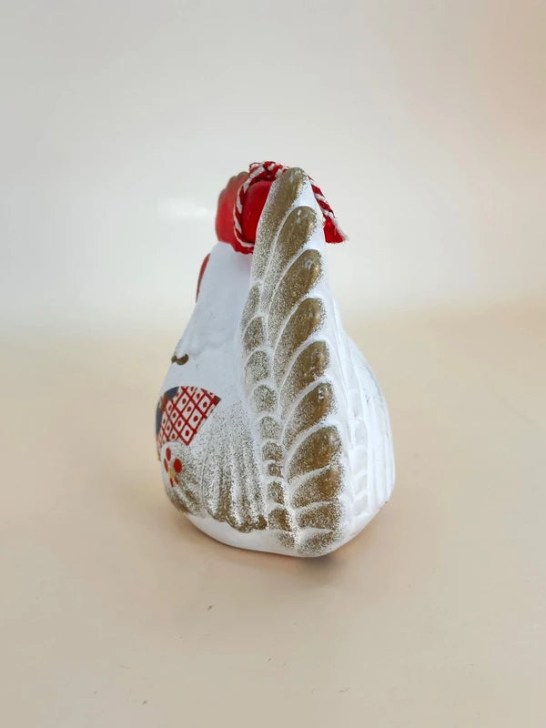 Cloche vintage en argile Dorei, fabriquée par Yakushigama (薬師窯), une entreprise de céramique renommée avec une histoire de plus de 1 000 ans, célèbre pour ses figurines traditionnelles japonaises et son art populaire. Le poulet est représenté dans une douce teinte blanche avec une crête rouge et un motif doré. Un cordon tressé rouge est attaché, permettant de l'accrocher ou de l'exposer facilement.