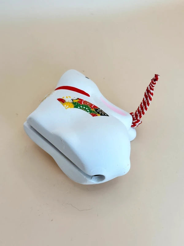 Les détails peints à la main comprennent un collier rouge vif, de délicates oreilles roses et un motif coloré sur le côté, inspiré des motifs japonais classiques, qui lui confèrent charme et richesse culturelle. Un cordon tressé rouge et blanc est attaché à la cloche, permettant de la suspendre ou de l'exposer comme un talisman décoratif. Dans la tradition japonaise, le lapin représente le progrès, la fertilité et la sécurité ; il était particulièrement apprécié comme gardien du zodiaque.