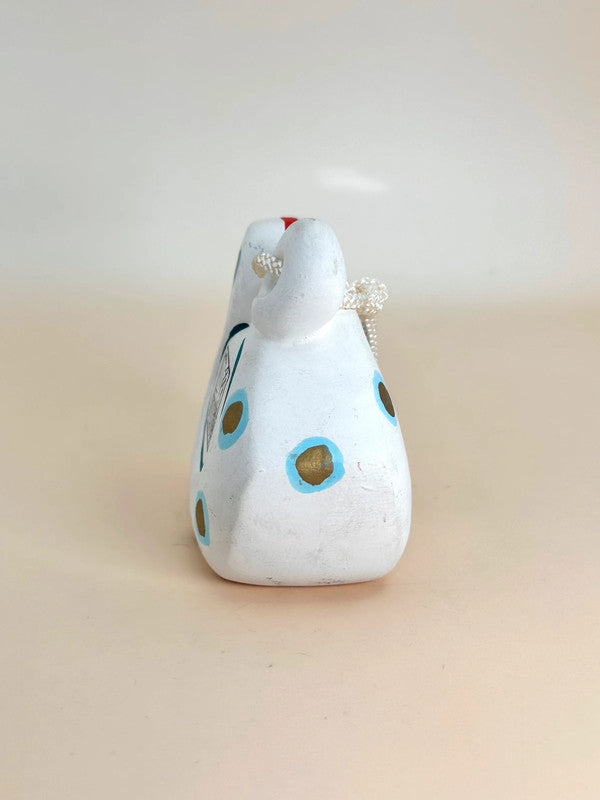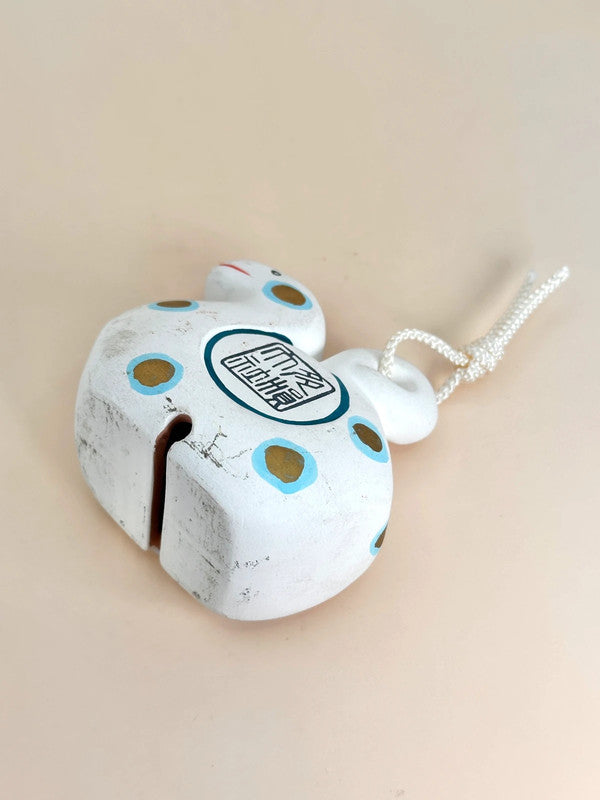 This vintage clay bell (dorei) is crafted in the form of a stylized white snake, a sacred animal in Japanese folklore often associated with protection, good fortune, and transformation. It originates from Taga Taisha (多賀大社) in Shiga Prefecture, a revered Shinto shrine known as the "Shrine of Longevity and Life Extension," dedicated to the deities Izanagi and Izanami.