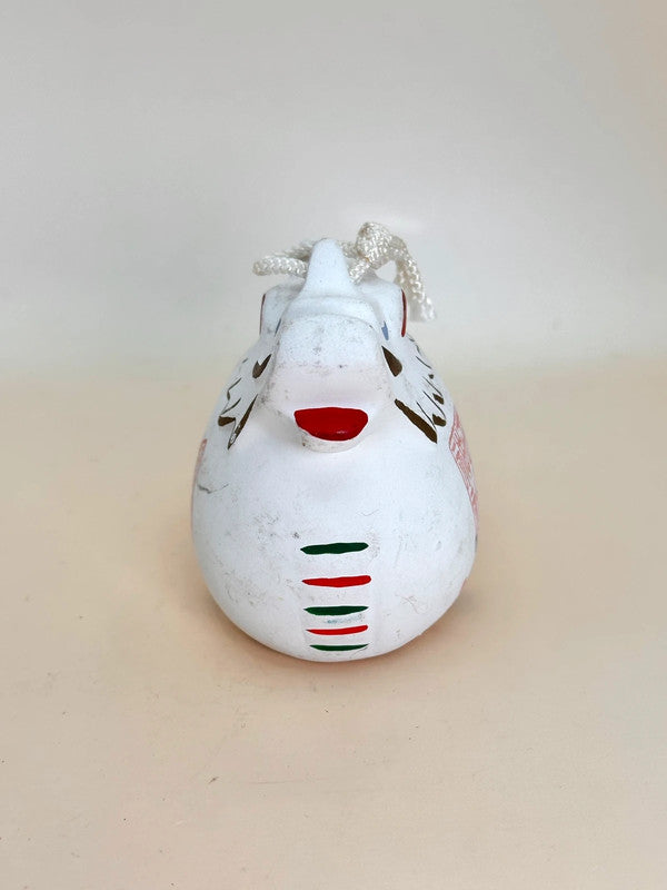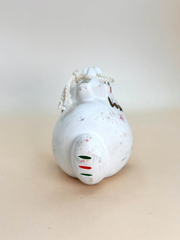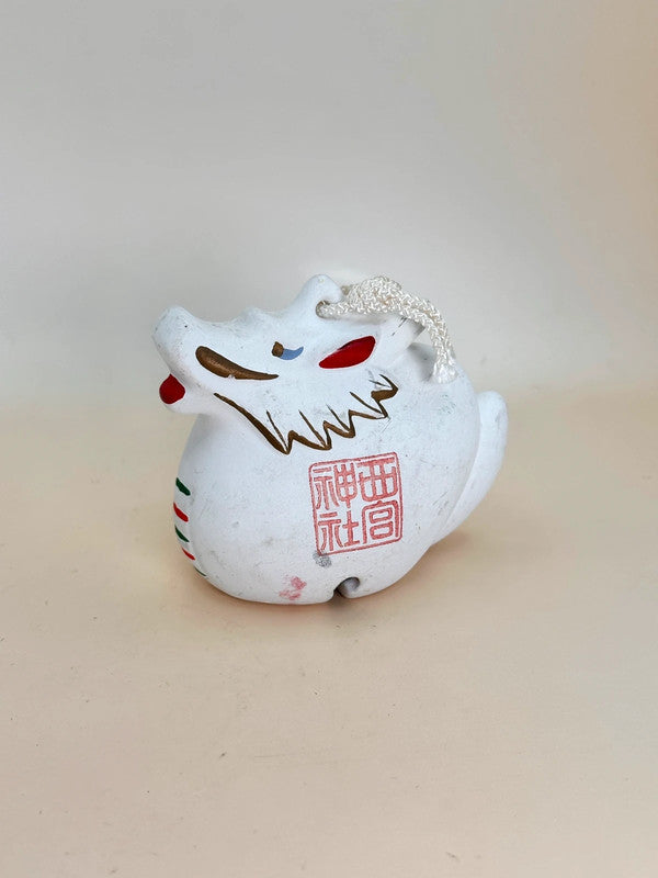 This vintage white clay bell (dorei) is shaped in the form of a mythical dragon, handcrafted as an engimono (auspicious charm) from the revered Nishinomiya Shrine in Hyōgo Prefecture. Adorned with vivid red and gold, the dragon’s face carries a bold, stylized expression, both protective and celebratory in spirit.