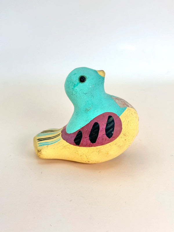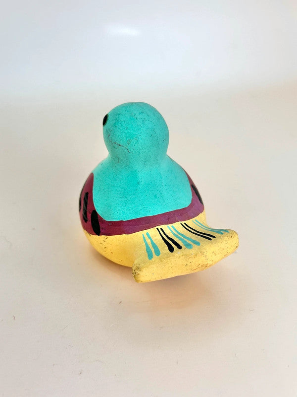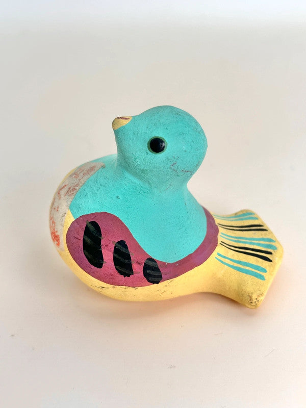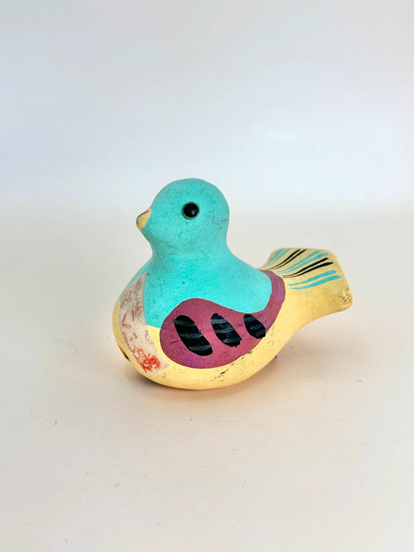 This delightful clay bell in the form of a dove is a charming piece of traditional Japanese folk craft from Usa in Oita Prefecture. The bird is hand-painted in vivid shades of turquoise, soft yellow, crimson, and black, evoking a gentle and auspicious aura. It is a representation of the "Mikuji Hato" (Fortune Dove), historically used in the practice of drawing sacred lots—omikuji (おみくじ)—at Usa Shrine (宇佐神宮), one of Japan's oldest and most revered Shinto shrines.