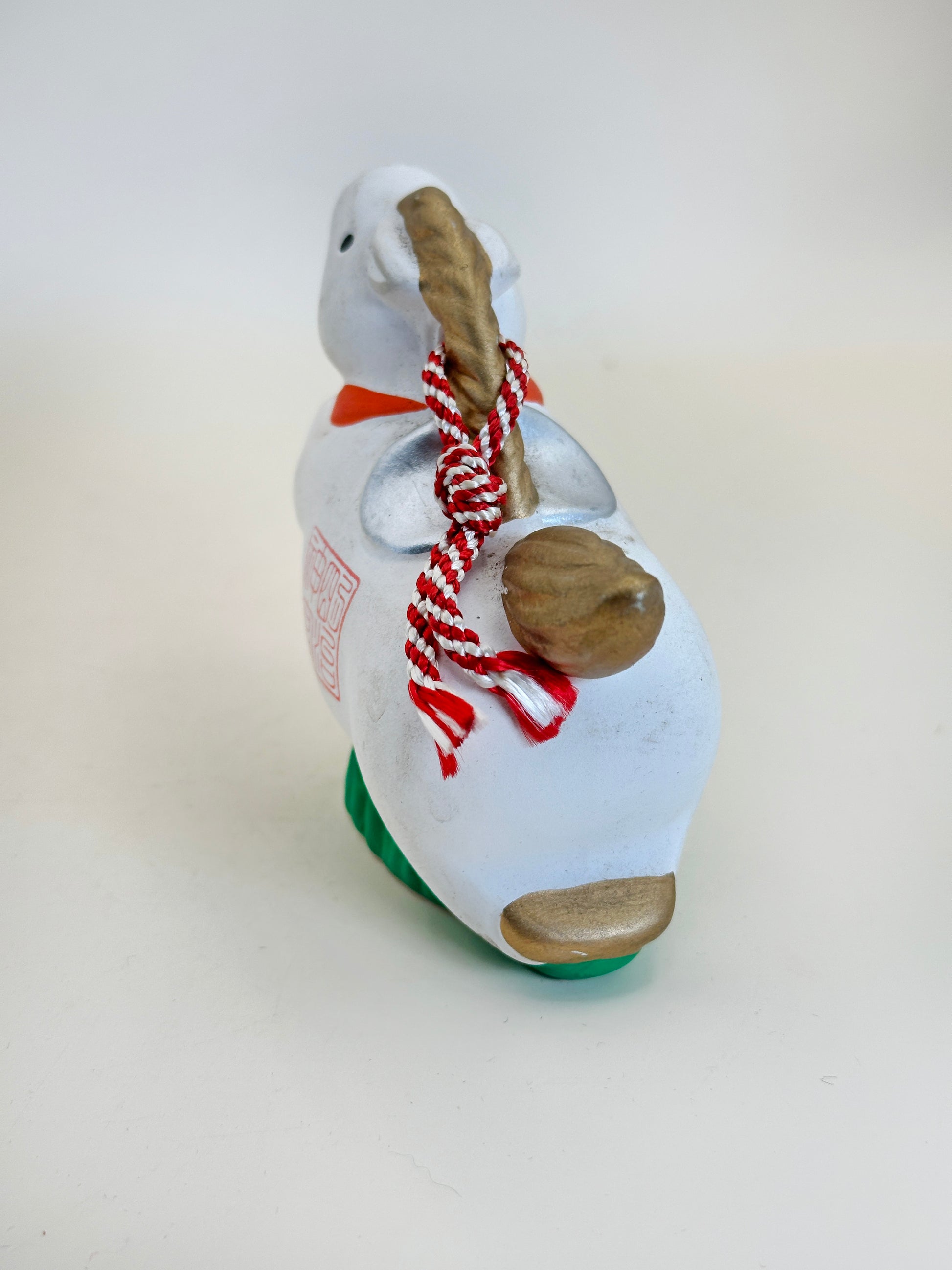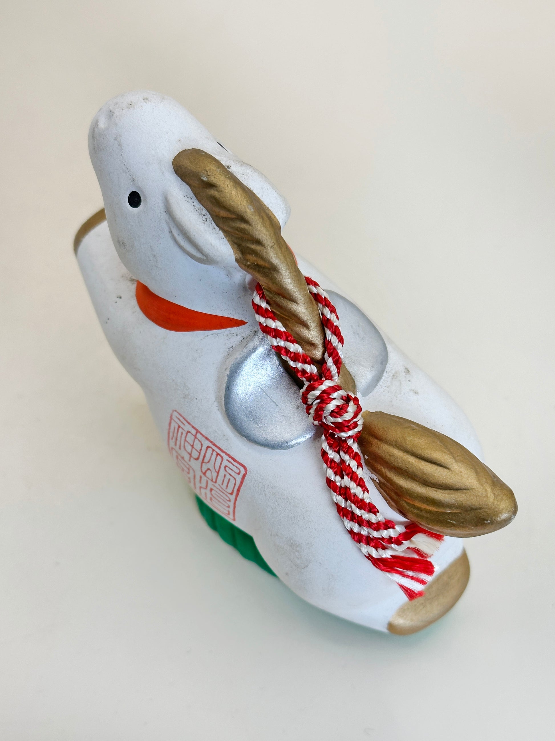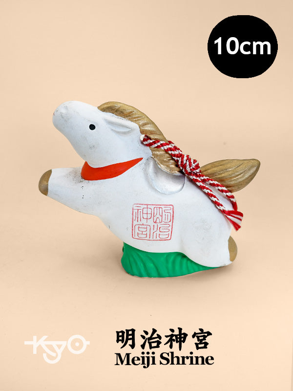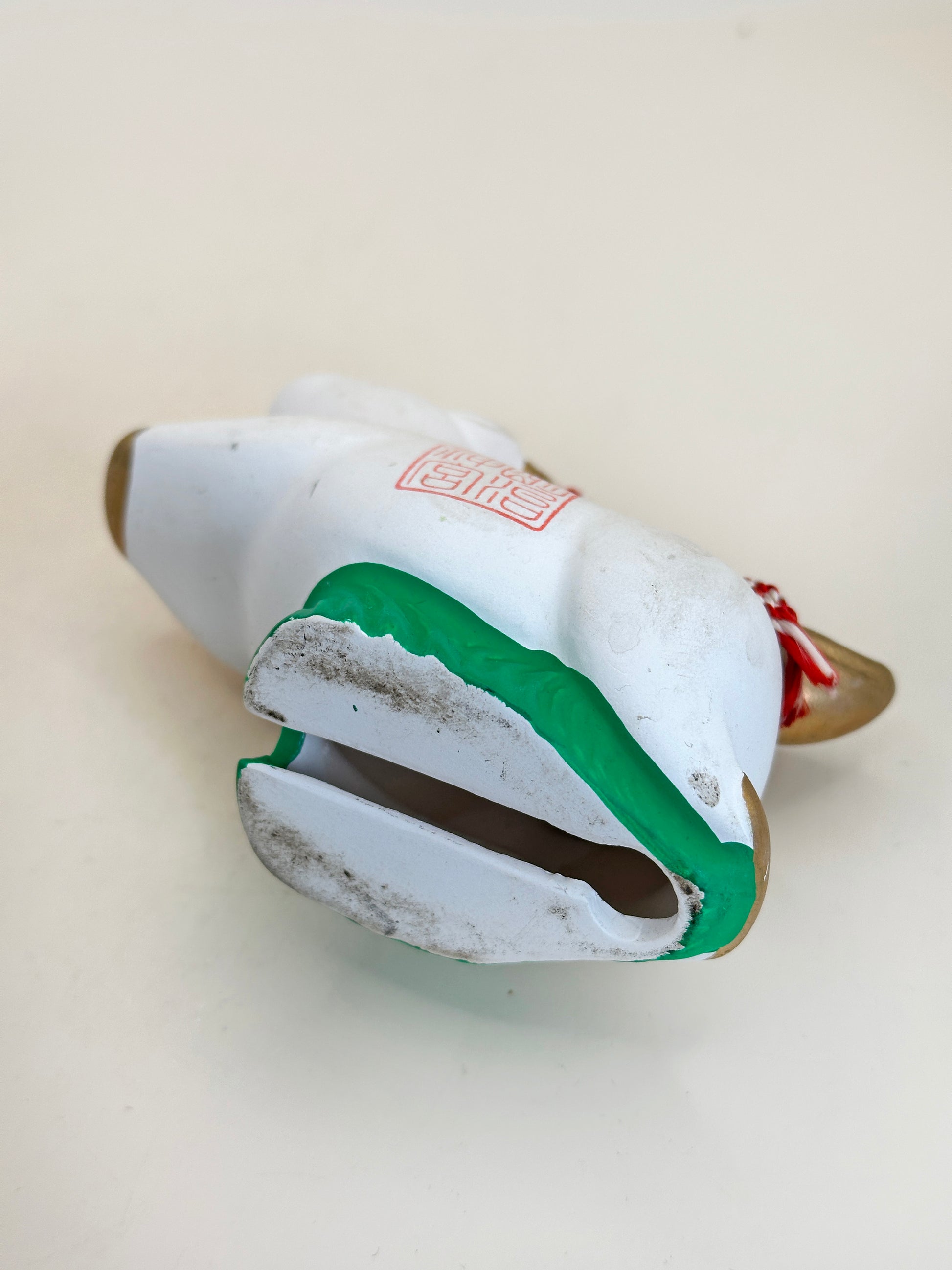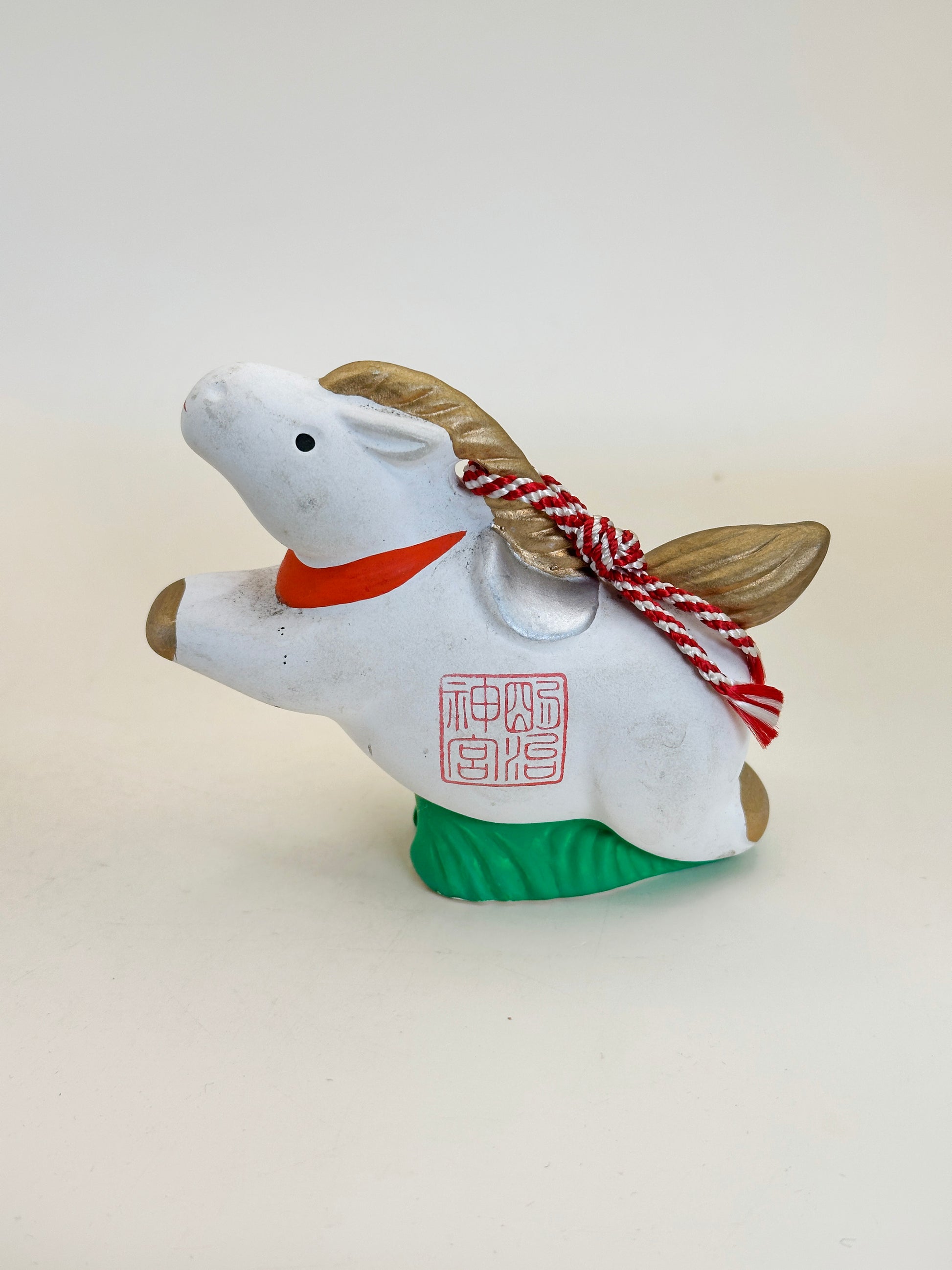 This is a vintage dorei (clay bell) in the shape of a white sacred horse, known as shinme (神馬), originating from Meiji Jingū (明治神宮) in Tokyo. Gracefully sculpted with smooth curves and painted in white with golden hooves, mane, and tail, the horse is depicted mid-gallop over a green base, capturing a sense of divine vitality and purity.