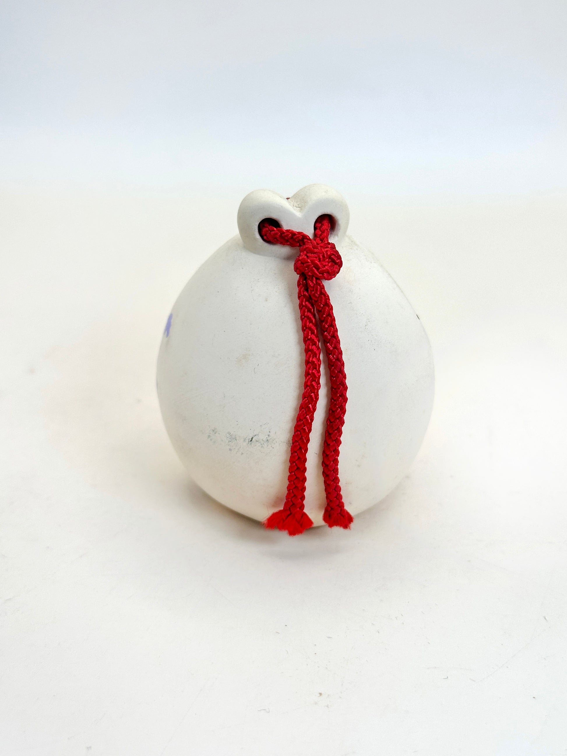 This charming dorei (土鈴) clay bell is crafted in the style of a traditional Hakata ningyō (博多人形), a celebrated form of Japanese folk doll from Fukuoka Prefecture. Formed in a rounded, gourd-like shape, the bell depicts a smiling woman with delicate features, rosy cheeks, and closed eyes conveying a sense of calm and joy. She wears a white kimono adorned with hand-painted floral motifs in purple, green, and red, enhancing the soft elegance of the figure. The red cord on top allows it to be hung, adding to its function as both a decorative object and a lucky charm.