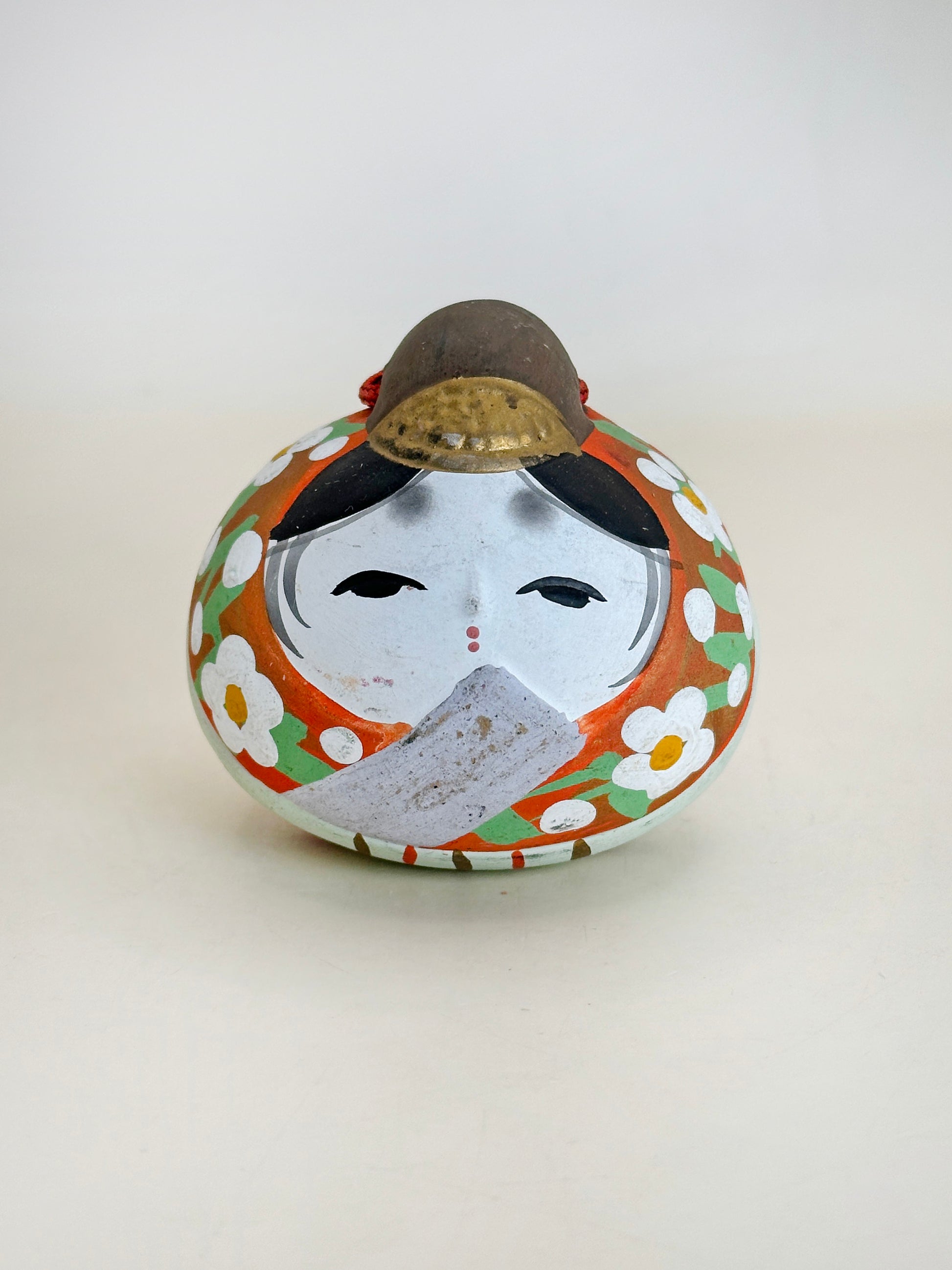 This vintage dorei (clay bell) depicts an Ohinasama—the traditional female doll figure celebrated during Japan’s Hinamatsuri (Doll’s Festival). Handmade and painted with great care, the bell features a serene female face framed in a beautifully floral-patterned kimono. The bright orange and green hues, accented with white blossoms, give the bell a vibrant yet gentle aesthetic.