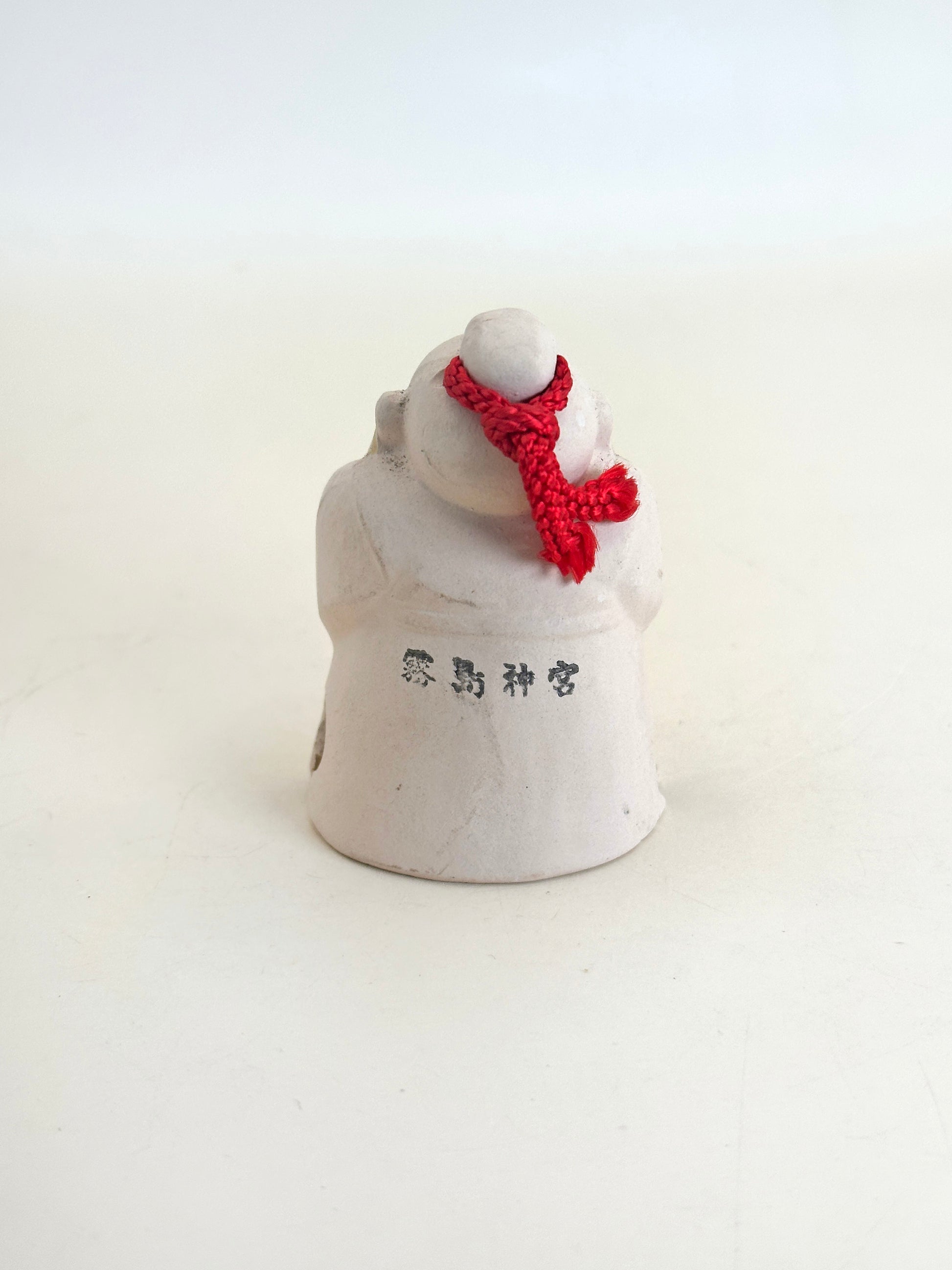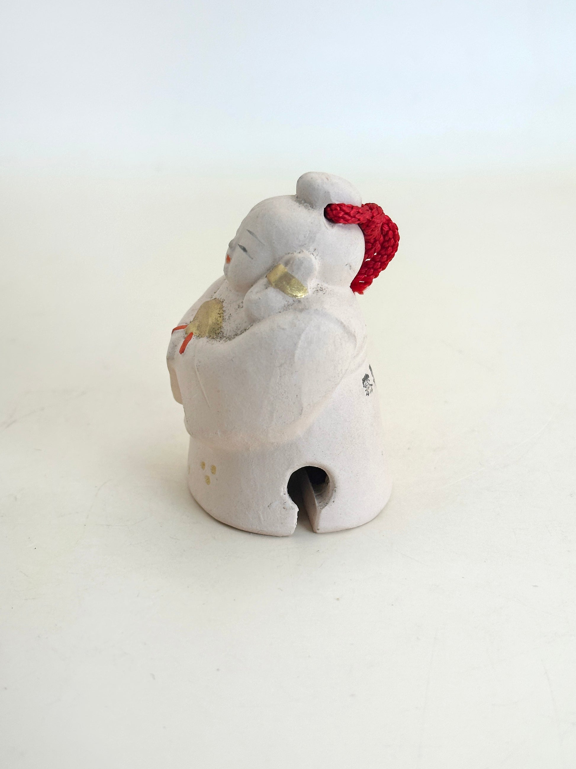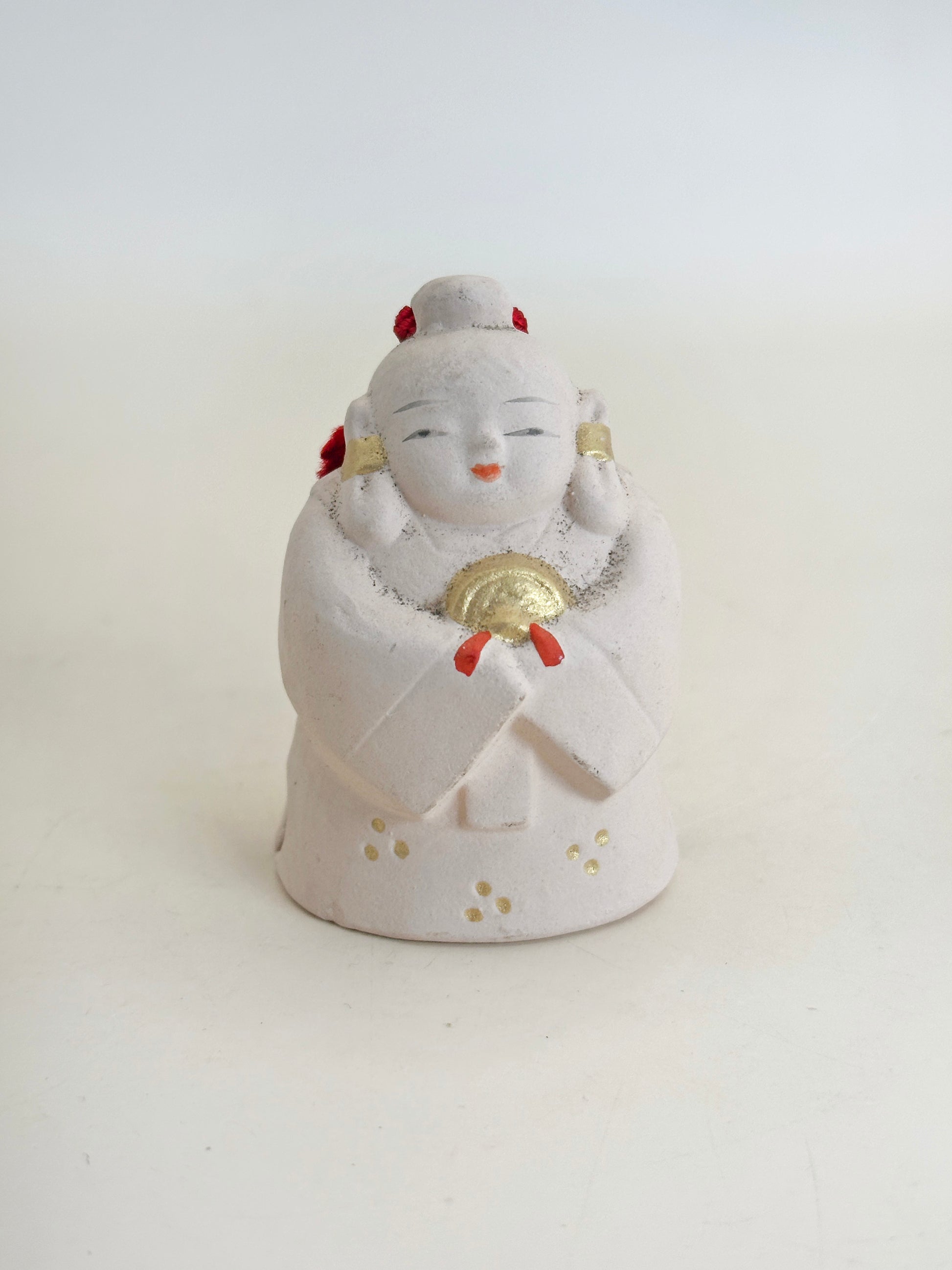 This delightful dorei (clay bell) represents a Kamiyo-suzu (神代鈴)—a sacred bell rooted in Japan’s mythological age (kamiyo, or "age of the gods"). With its serene expression, delicate hand-painted details, and the gold-accented bell clasped between its hands, this figure radiates a sense of peace, reverence, and divine grace.