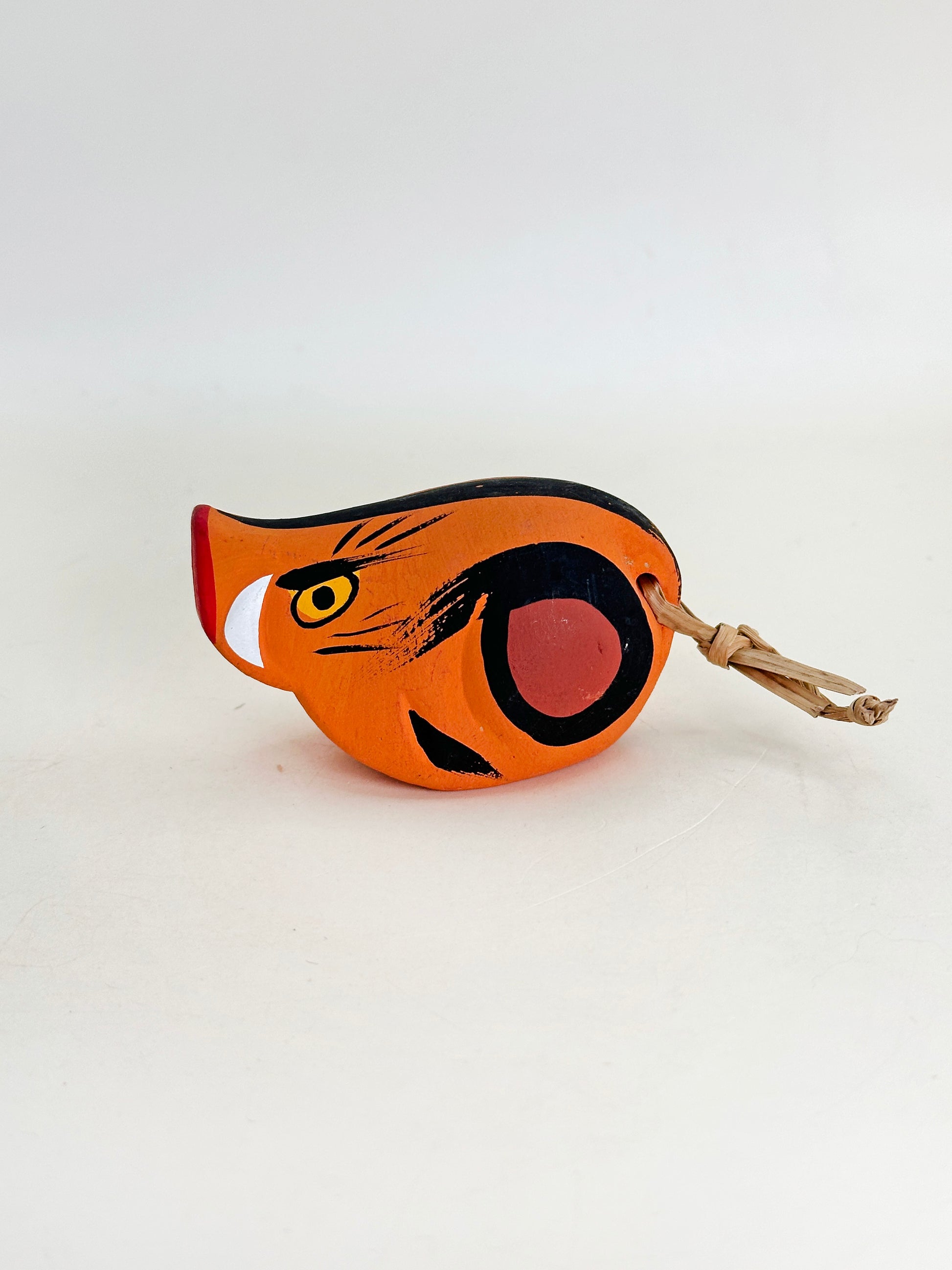 Thisvintage dorei (clay bell) in the form of a stylized boar is a charming folk craft from Kishima-yama (きしま山), a region known for its rustic, hand-crafted figurines and traditional toys. Boldly painted in vibrant orange with expressive black and red markings, the boar is depicted in a minimalist, rounded shape with striking tusks and a fierce, alert eye — capturing both the strength and spirited energy associated with the wild boar in Japanese culture.