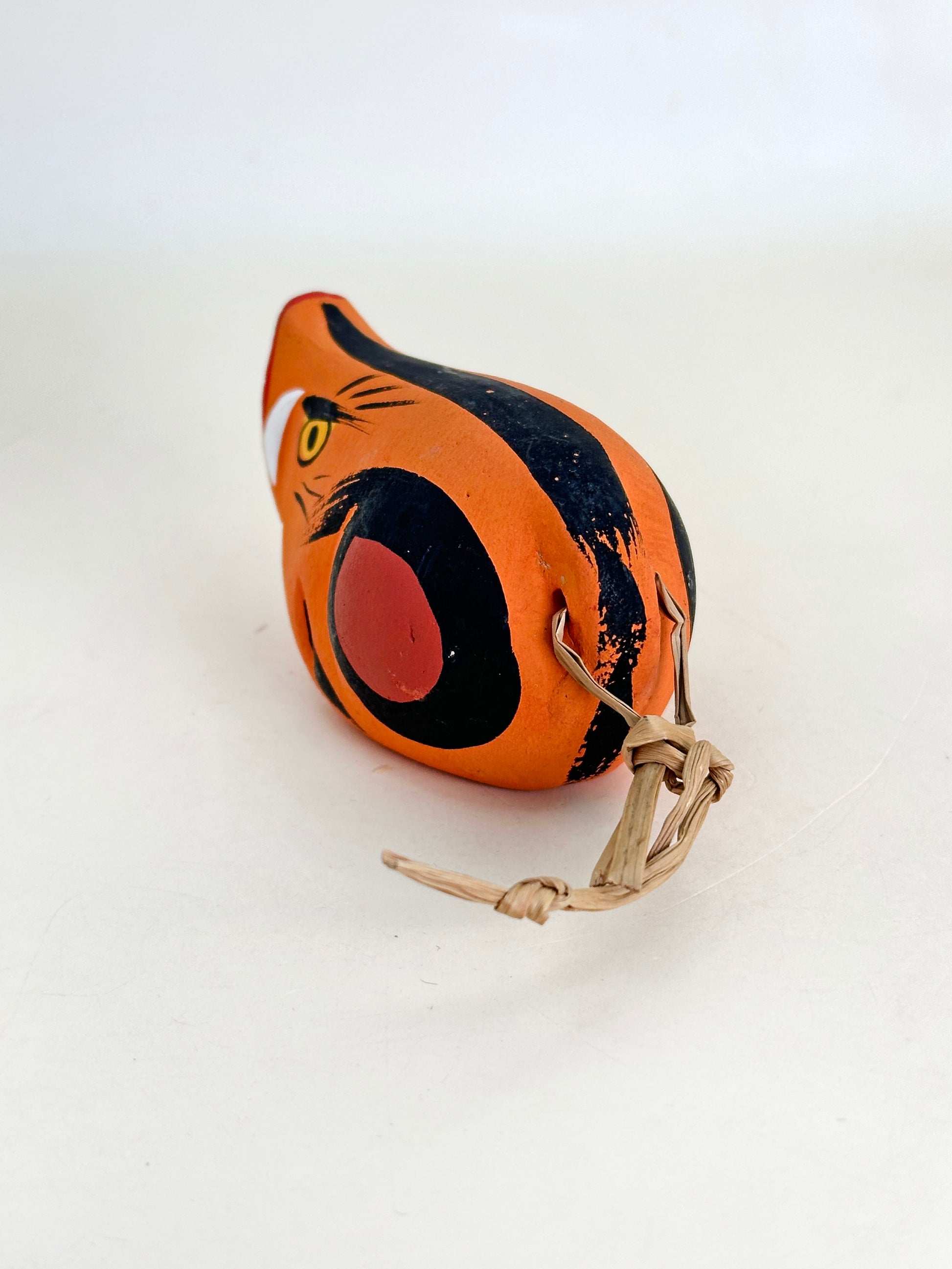 Finished with a natural straw tie, the figure preserves a nostalgic, handmade quality typical of regional mingei (folk art). When shaken, the bell produces a gentle, earthy chime, echoing the warmth and sincerity of rural Japanese craftsmanship.