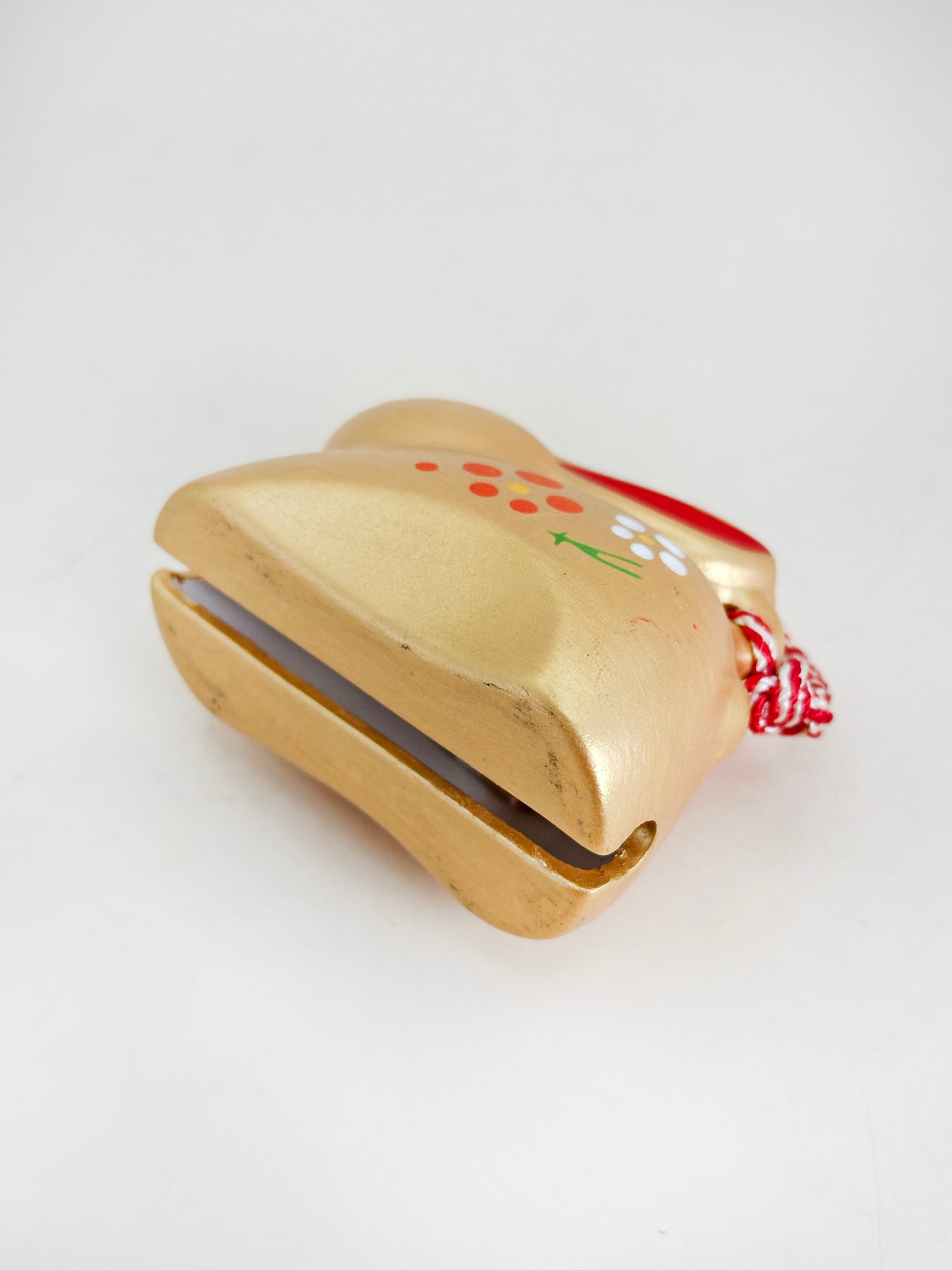 This Dorei clay bell from Yakushigama (薬師窯) is shaped in the form of a golden rabbit, gracefully captured in a crouching pose with alert red-tipped ears. Its surface is adorned with delicate plum blossom motifs in red and white, along with a green leaf design, evoking seasonal joy and traditional auspicious symbols.
