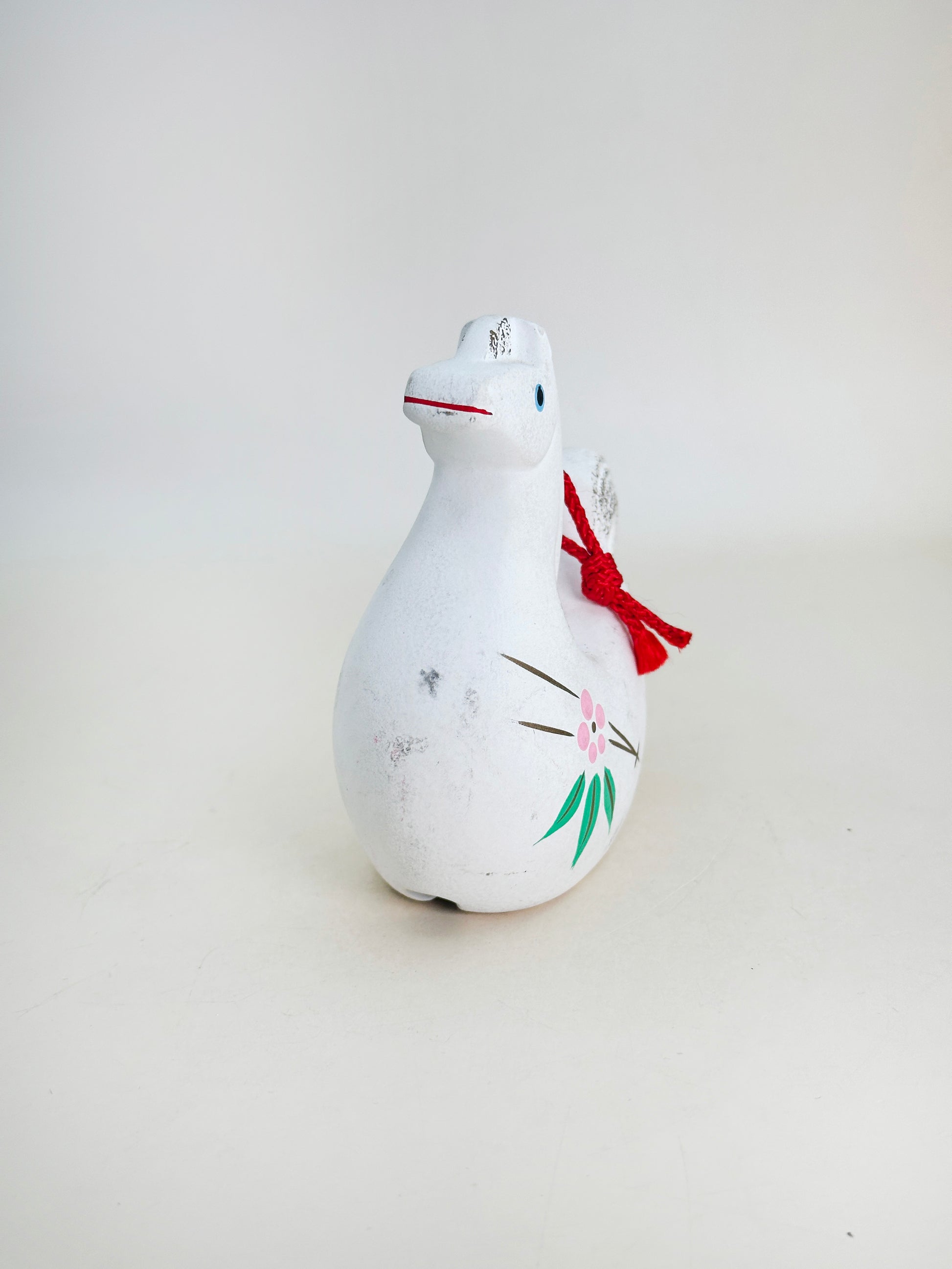 This vintage dorei (土鈴) clay bell of a shinme (sacred horse) 神馬, rendered in a simple yet elegant Shōwa-era folk style. The figure features a rounded, plump body, typical of mid-20th century Japanese craft aesthetics—with a gentle, stylized expression, emphasizing purity and innocence.