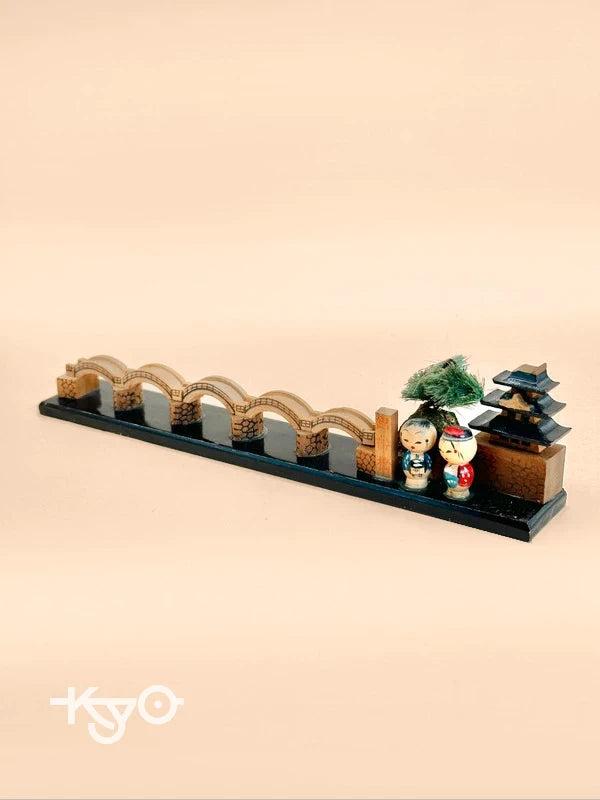 À l'une des extrémités du socle se dressent deux adorables figurines de style kokeshi : un garçon et une fille en kimono accueillent les visiteurs avec une douceur et une nostalgie charmantes. À côté d'eux, une pagode noire stylisée et un pin évoquent la tranquillité du paysage environnant, souvent visité pour ses cerisiers en fleurs au printemps et ses feuilles d'érable éclatantes en automne. Le poteau en bois orné de caractères gravés ancre encore davantage le décor d'Iwakuni.