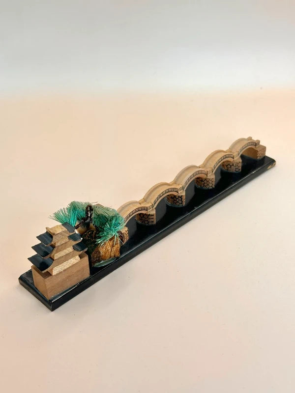 Cet artisanat traditionnel japonais est un charmant omiyage (souvenir) du Kintaikyō (錦帯橋), le célèbre pont historique en arc de bois d'Iwakuni, dans la préfecture de Yamaguchi. Assemblé et peint à la main avec soin, cet objet capture la beauté pittoresque de ce pont emblématique à cinq arches, merveille de la menuiserie traditionnelle japonaise et monument culturel précieux.