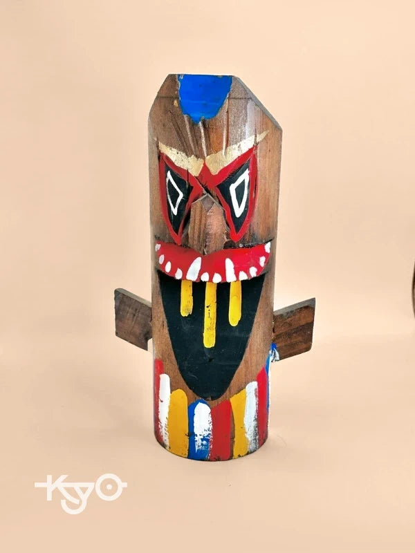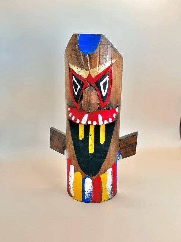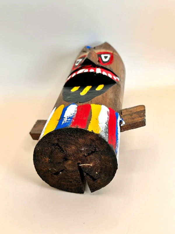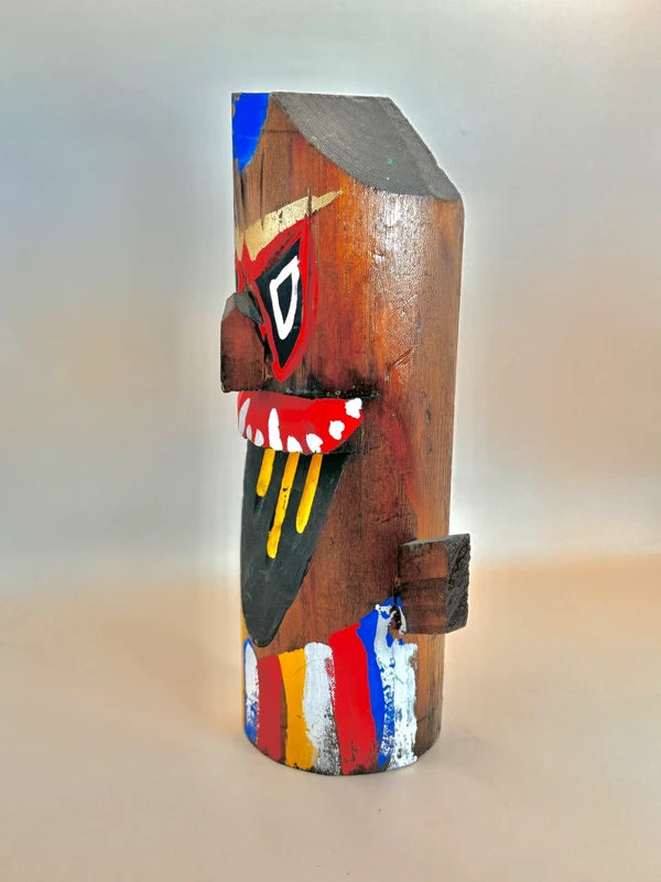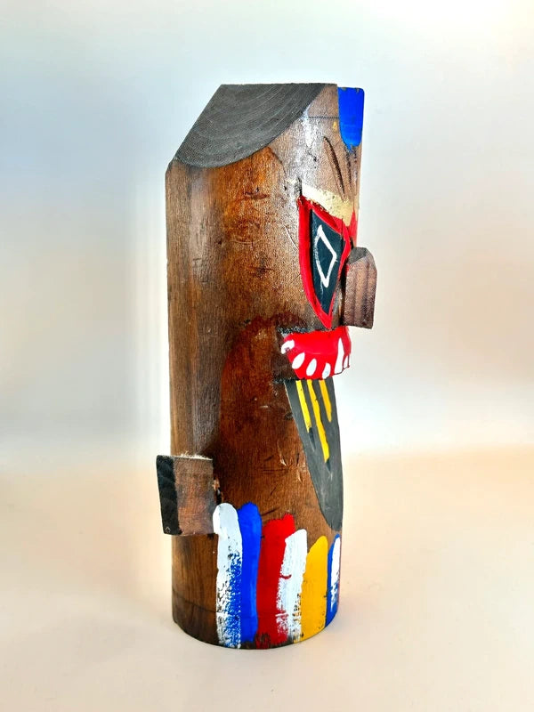 Sculptée à la main dans du bois et peinte de couleurs vives et primitives, cette pièce présente un visage comique et féroce, des yeux démesurés et une bouche ouverte aux dents jaunes pendantes. La peinture audacieuse de son corps cylindrique et de ses bras en croix lui confère une présence puissante.