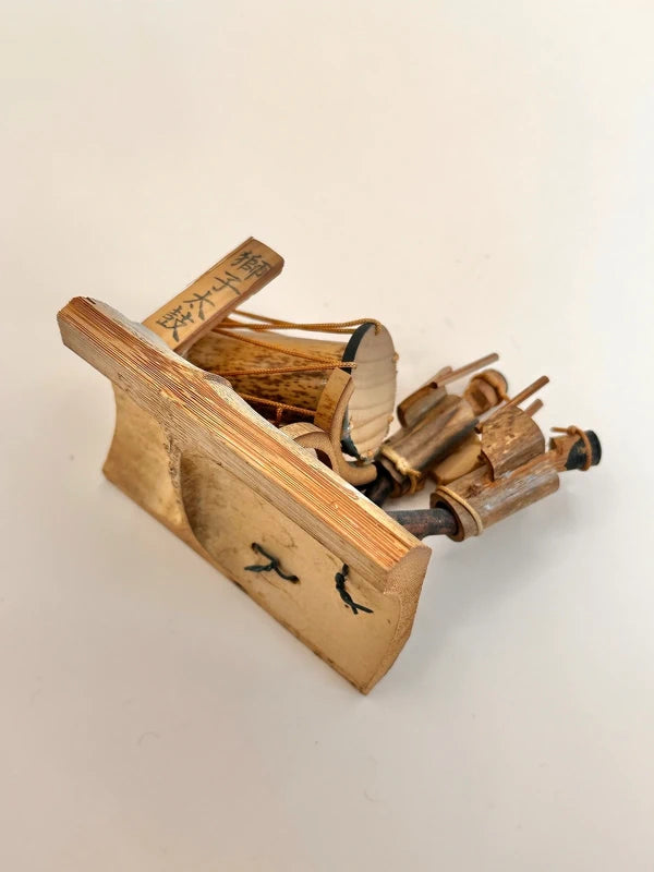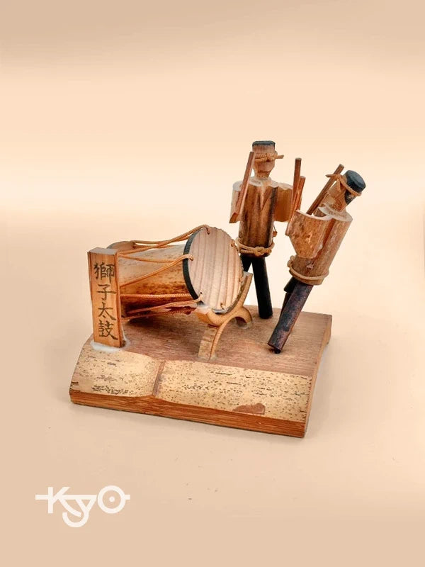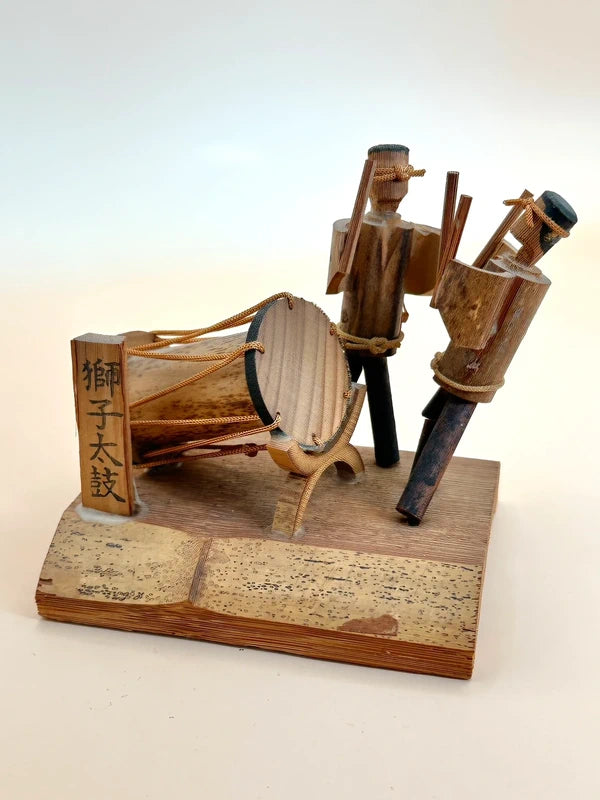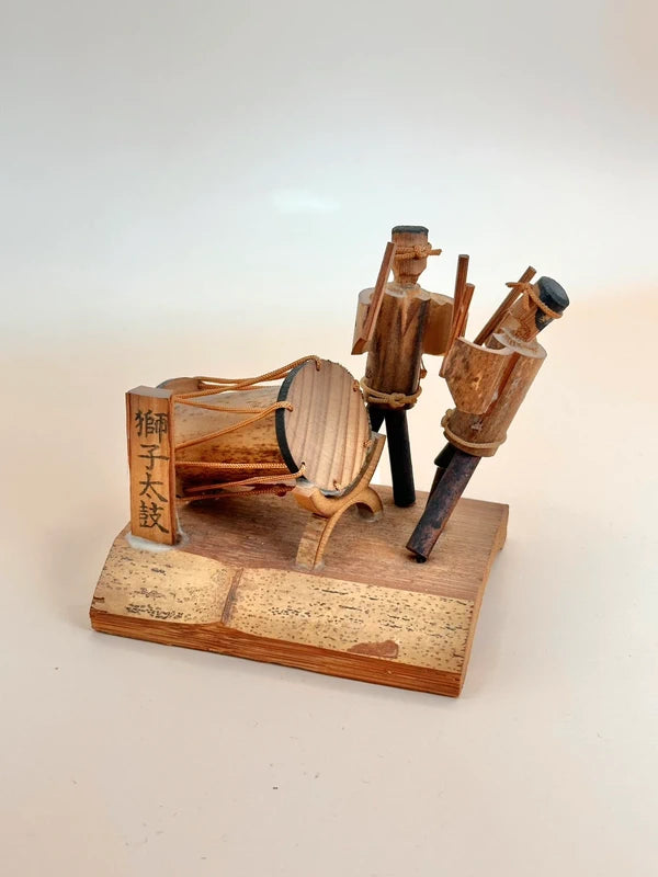 Une œuvre d'art vintage en bambou représente deux personnages stylisés au cœur d'une représentation traditionnelle de 獅子太鼓 (Shishi Daiko) : la danse du lion accompagnée du rythme puissant du tambour taiko. Entièrement fabriqué à la main en bambou naturel, cet ensemble 竹人形 (takeningyō, ou poupée en bambou) capture l'essence même de l'esprit festif vibrant du Japon à travers des textures rustiques et une forme minimaliste.