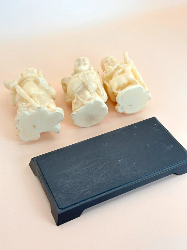 Cet ensemble de figurines vintage en résine représente le trio emblématique de divinités chinoises Fu, Lu et Shou, symboles de chance, de prospérité et de longévité. Fabriquées en résine et imitant l'ivoire, les trois figurines sont disposées côte à côte sur un socle noir, chacune présentant des attributs uniques reflétant son rôle distinct dans la culture traditionnelle chinoise.