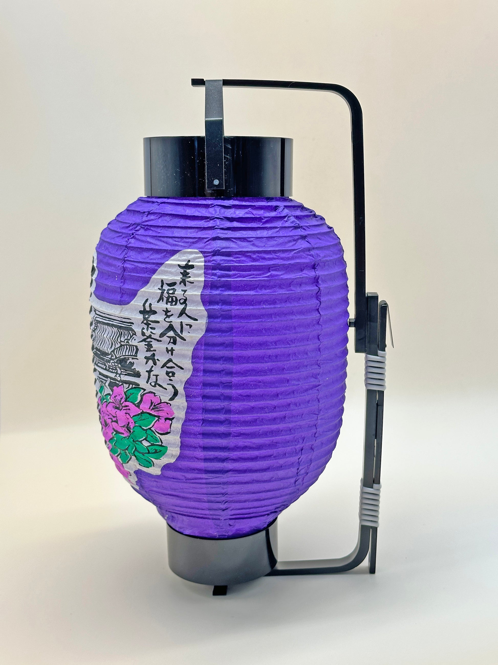 The lantern is predominantly purple and features hand-painted style artwork including pink and purple flowers with green leaves, as well as a depiction of a temple structure. The top and bottom ends are reinforced with black plastic fittings, ensuring durability and allowing the lantern to collapse and expand easily. A black carrying handle is attached at the top for hanging, and a foldable supporting frame is fitted on the side, allowing it to be stored compactly when not in use.
