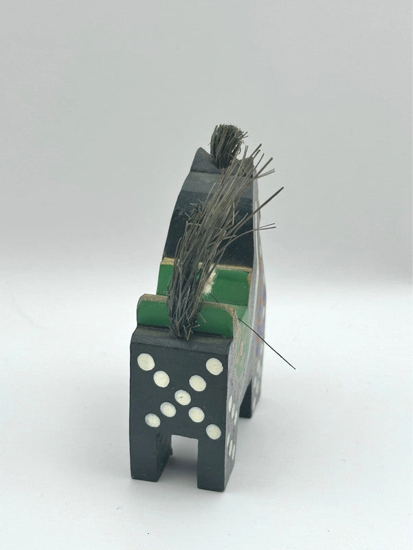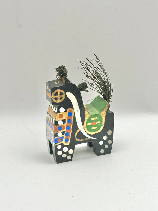 Jouet folklorique vintage. Le cheval porte-bonheur Miharu Goma. On croit que les chevaux noirs sont des porte-bonheur pour une naissance facile et sans danger et l'éducation d'enfants forts et en bonne santé, tandis que les chevaux blancs sont des amulettes de longévité et de retraite heureuse.