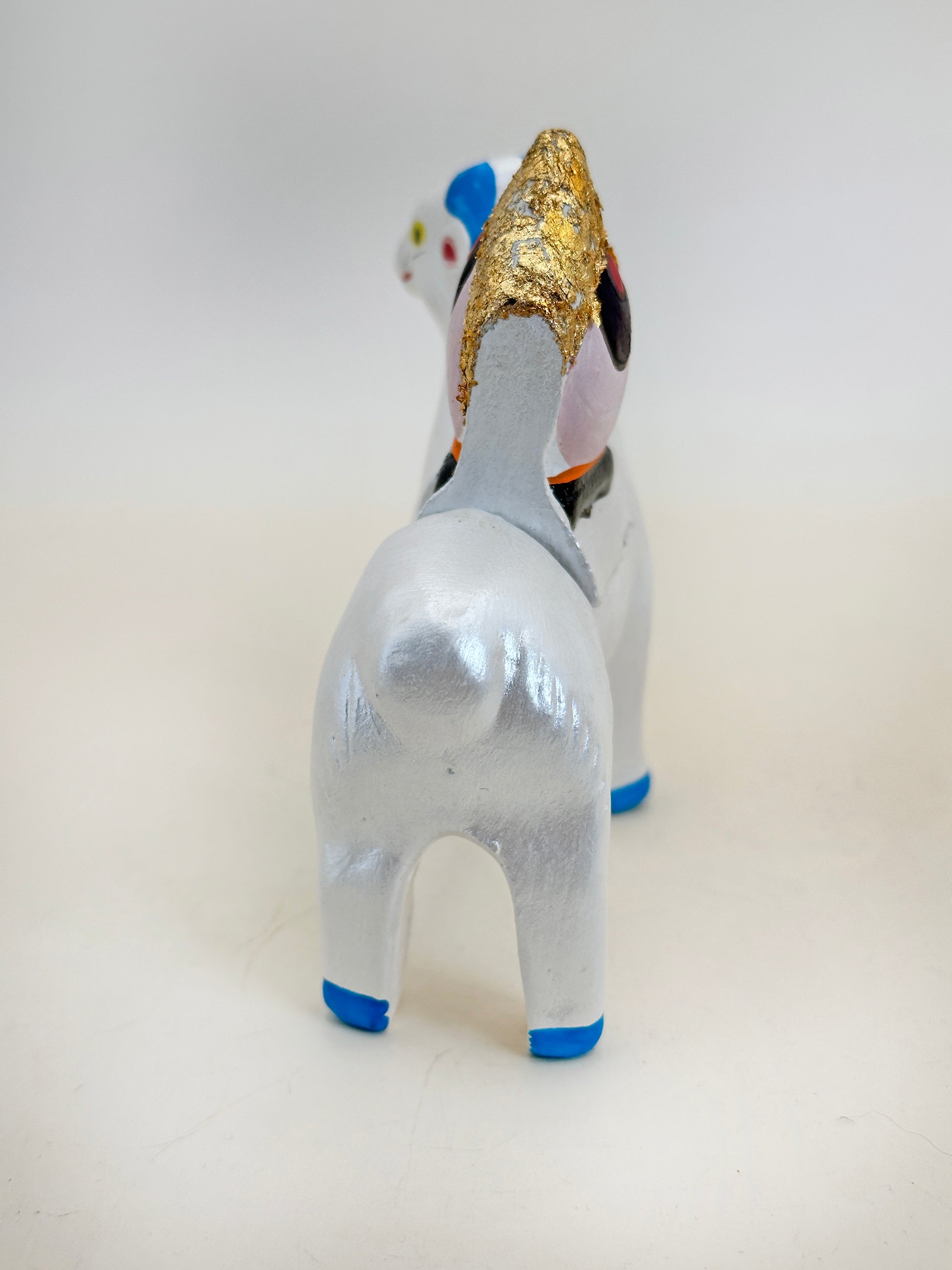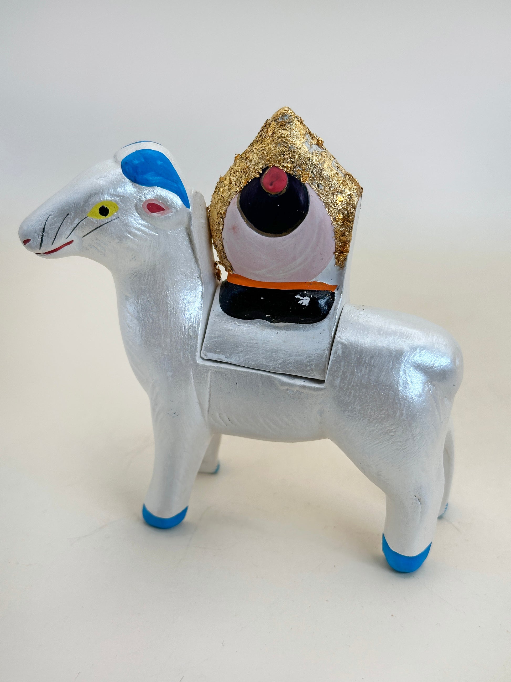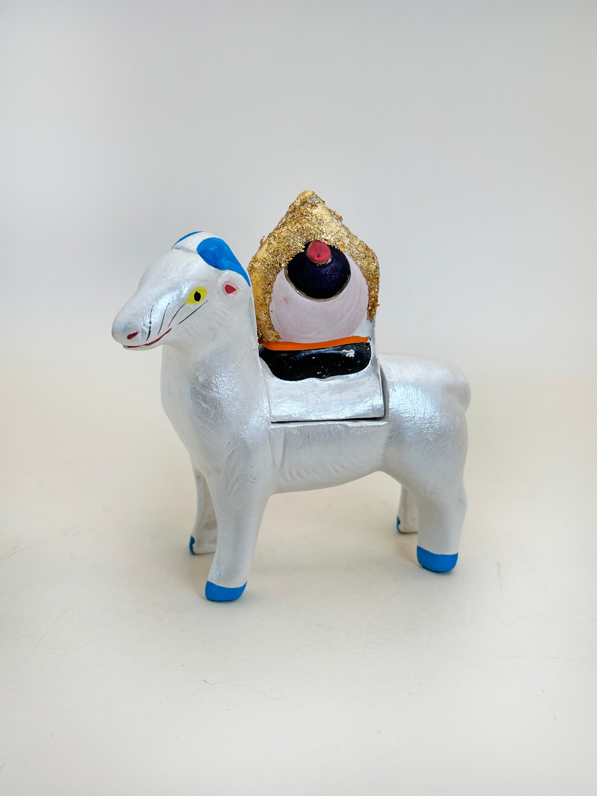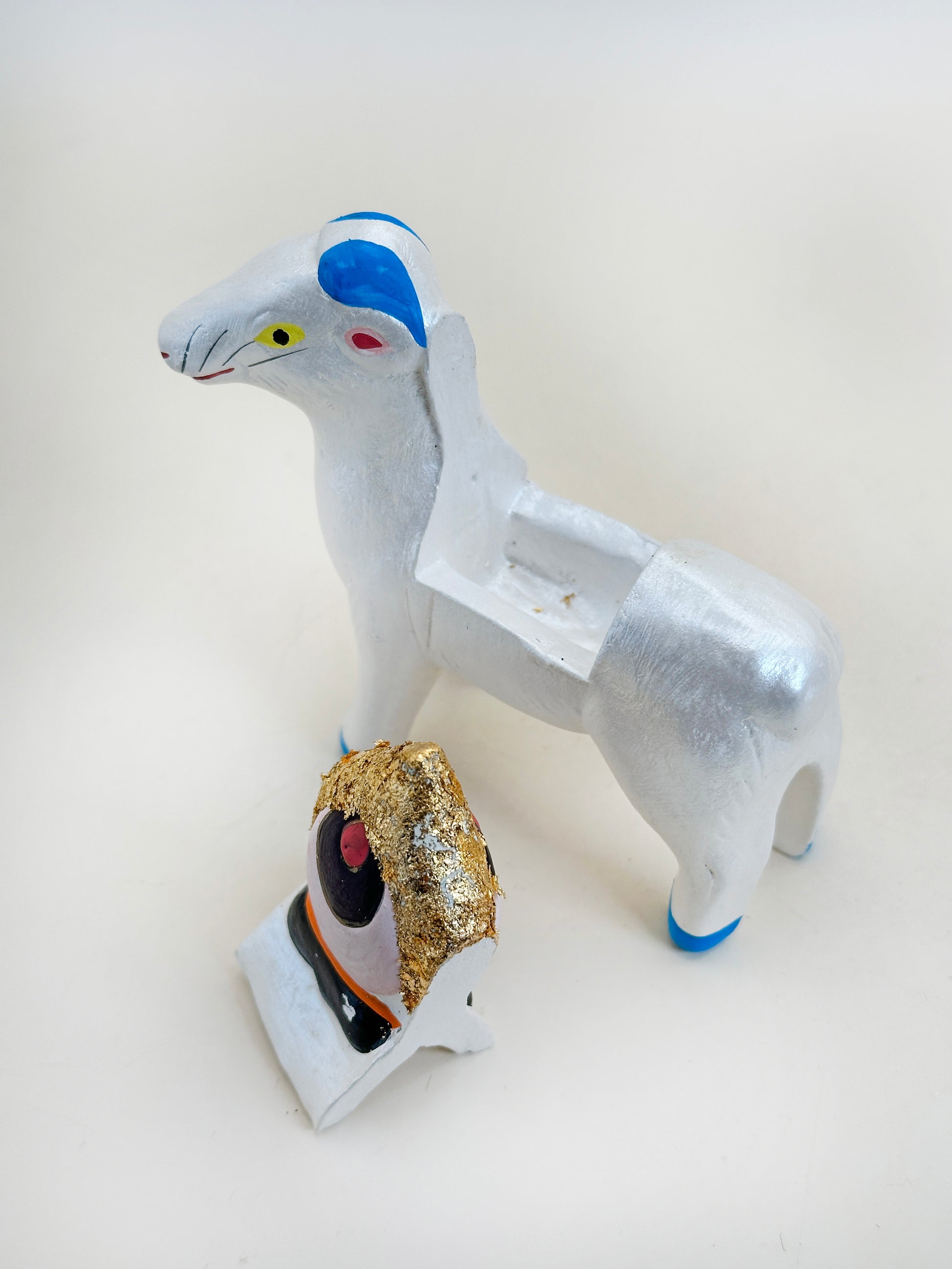 Shaped as a white ram with a soft pearlescent finish, the figure carries on its back a golden Hōju (宝珠), or flaming jewel — a sacred symbol in Buddhist iconography that represents wisdom, enlightenment, and the granting of wishes. The jewel is rendered in bold gold and red, radiating spiritual power and protection.