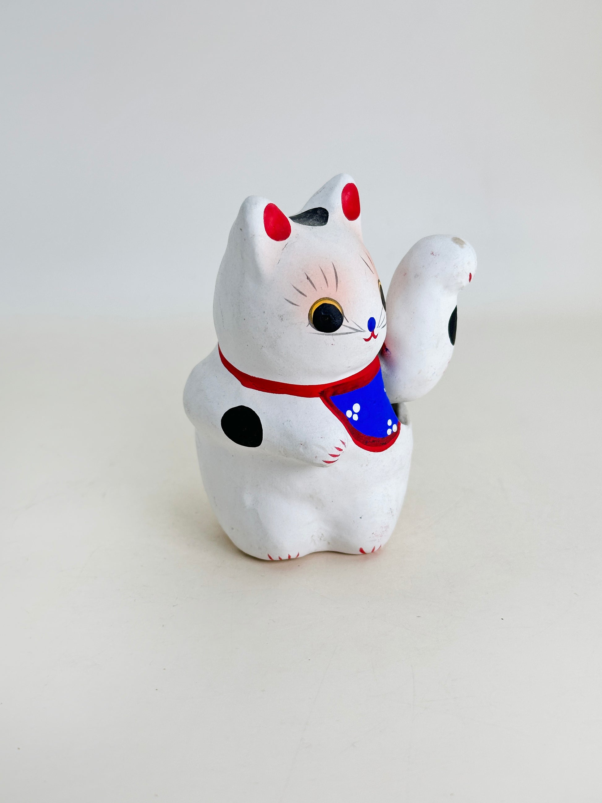 This particular figure features a Edo period styled cat with bold red and blue accents, a blue bib with polka dots, and the signature raised paw believed to attract good luck and customers. With its naïve expression and handmade imperfections, it carries the warm and nostalgic feel of mid-Showa-era folk toys.