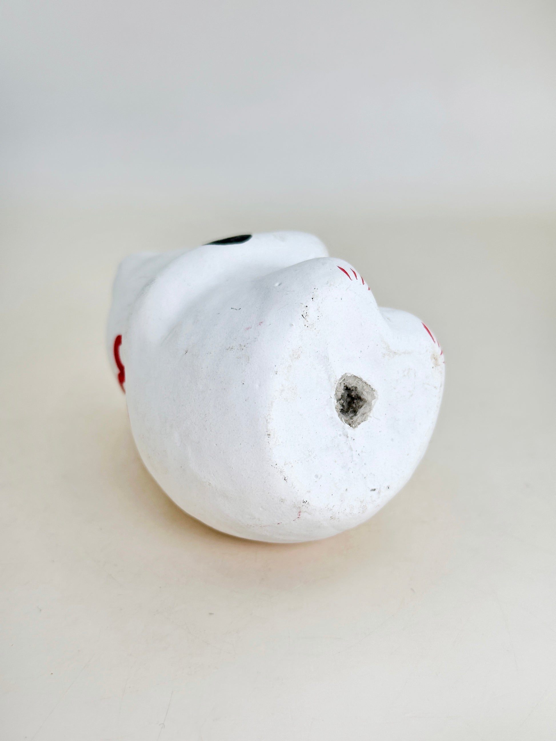 This Maneki-neko (beckoning lucky cat) is a vintage piece of Takasaki Hariko (高崎張子), a traditional papier-mâché craft from Takasaki City, Gunma Prefecture. Known for their soft, rounded forms and hand-painted folk-style features, Takasaki Hariko has been a beloved form of omiyage (souvenir) and engimono (lucky charm) since the Edo period.
