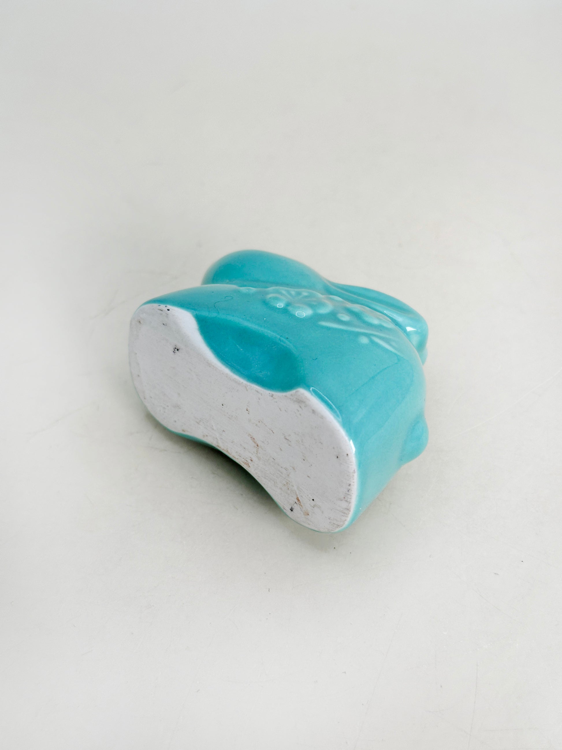 Finished in a luminous seiji, celadon glaze (青磁) , the surface displays a serene turquoise tone with a soft, glossy sheen. The glaze subtly pools along the contours of the rabbit’s ears and rounded body, highlighting its smooth silhouette and delicate modeling. On one side, a discreet opening allows toothpicks to be stored neatly inside, blending functionality with decorative charm. A floral relief motif is lightly molded into the body, adding a refined seasonal touch without disturbing the minimalist aesthetic.