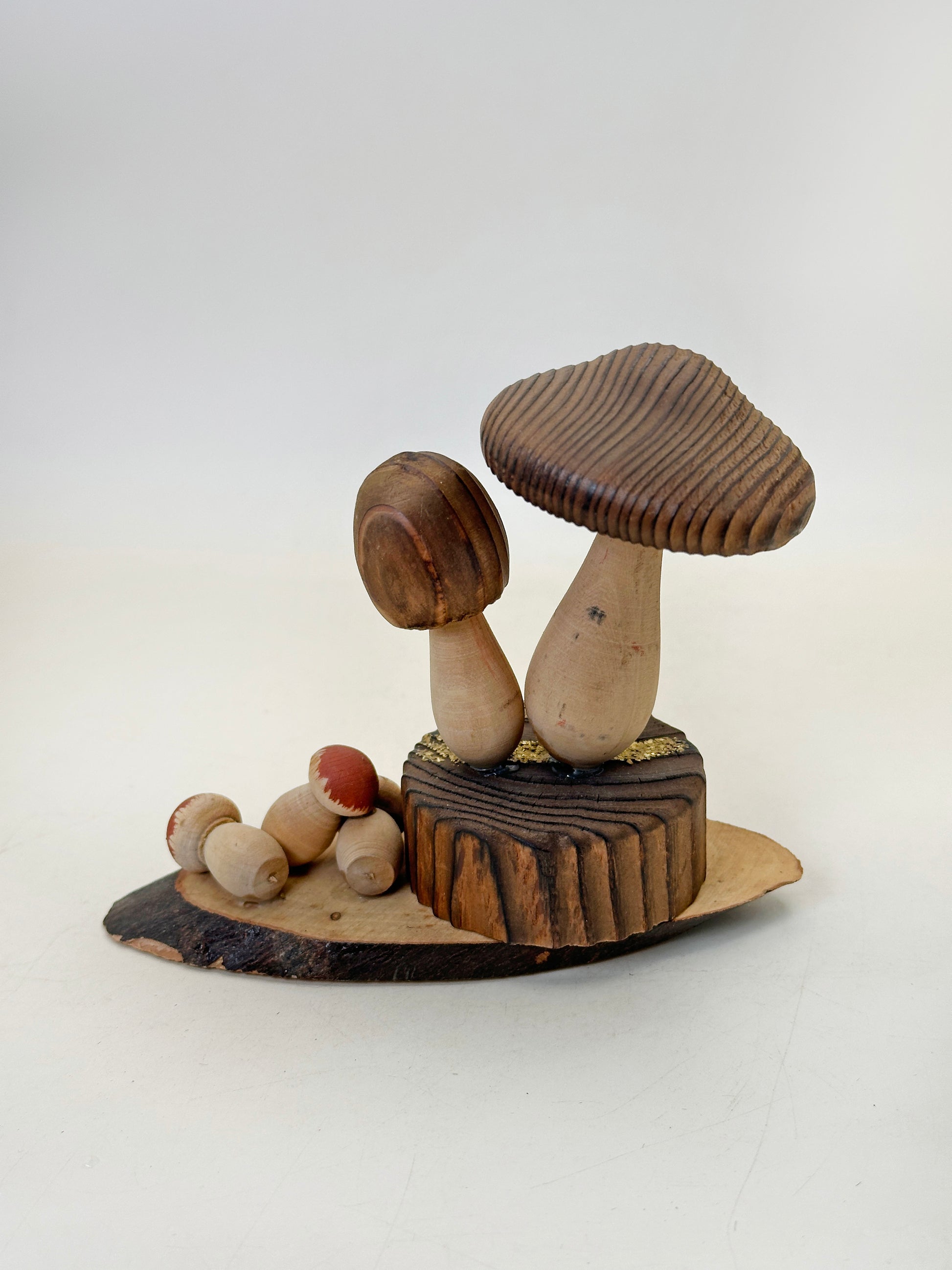 Crafted from natural wood and finished with subtle carved textures that emphasize the mushroom caps and stems, the piece reflects the rustic charm typical of regional Japanese omiyage souvenirs. These souvenirs were often purchased by travelers visiting scenic destinations and hot spring resorts, serving as small reminders of the local landscape.