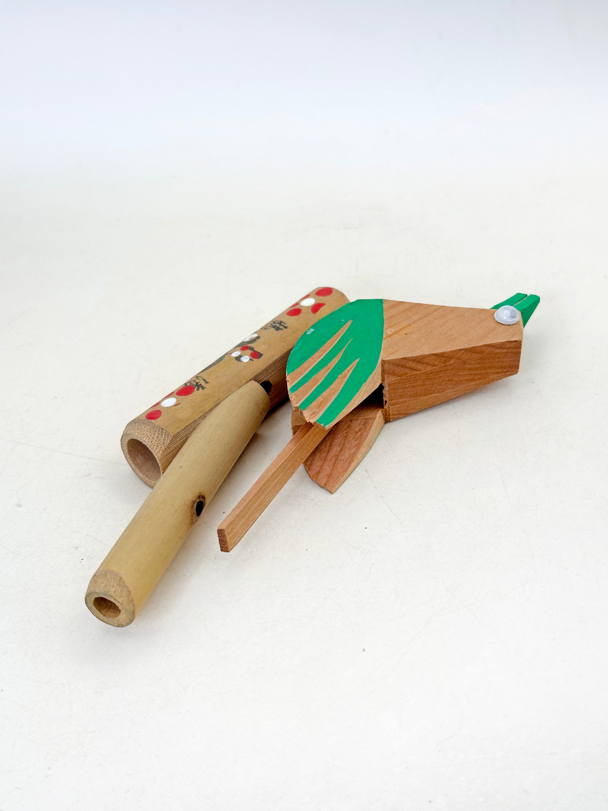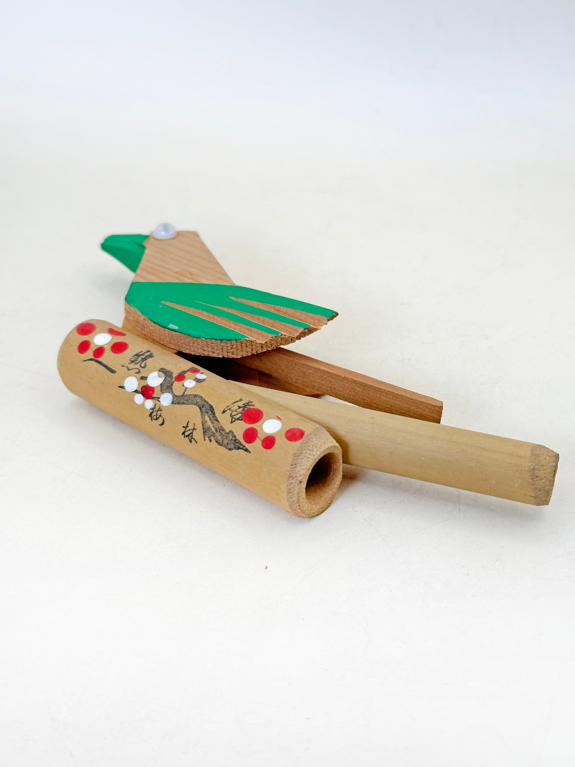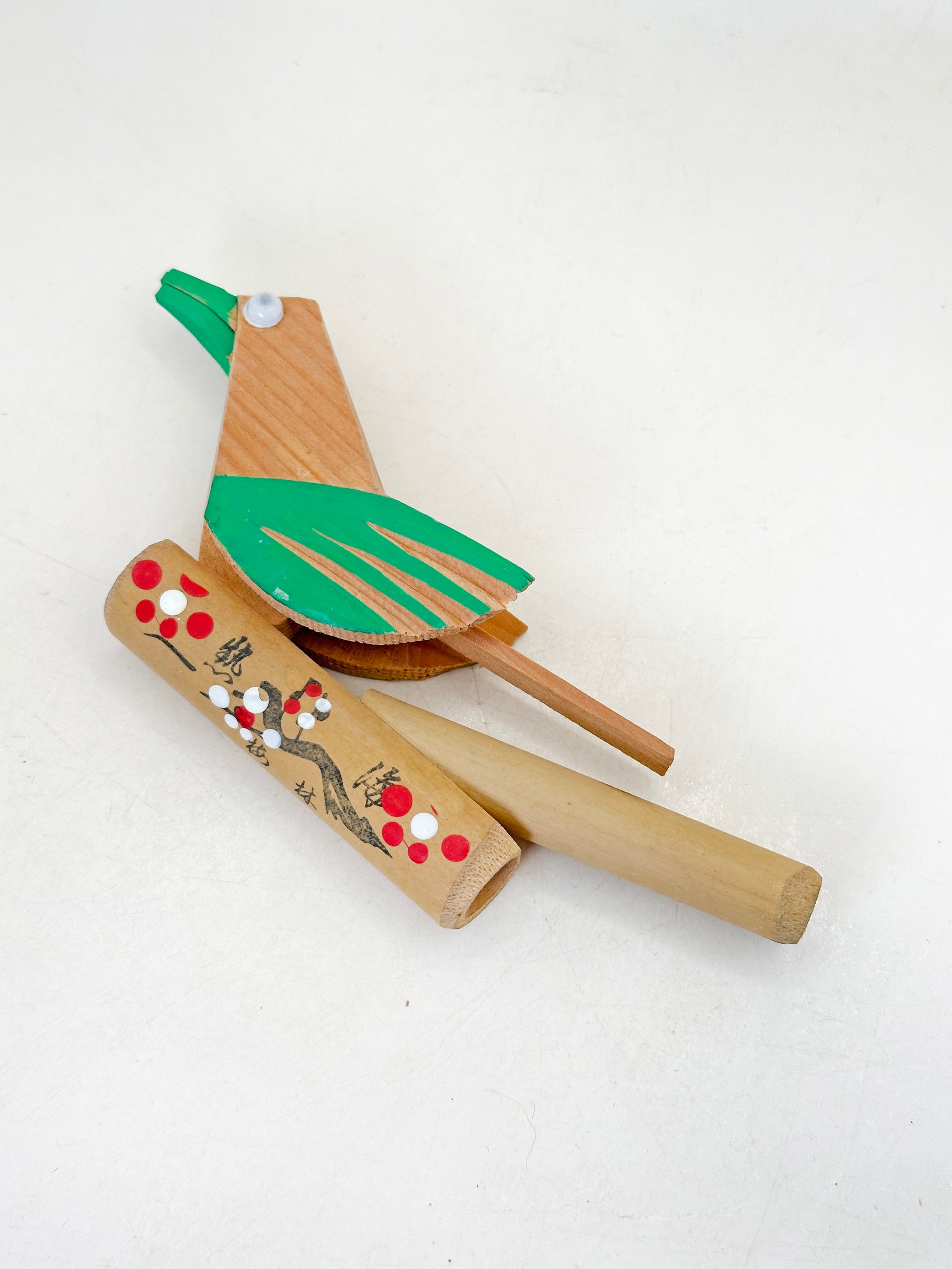 Carved from light wood, the whistle takes the form of a stylized bird with a simple, geometric body and gently painted green wings and beak. Its minimal yet expressive design reflects the warmth and handmade character typical of regional folk toys. The bird is mounted on a small pivot, allowing subtle movement, while the attached bamboo whistle tube is decorated with hand-painted plum blossoms (梅), a classic motif symbolizing resilience and the arrival of spring.