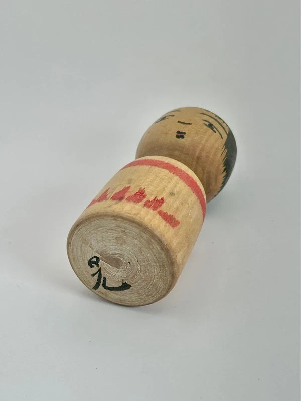 La poupée présente une forme simple et arrondie et des traits du visage minimalistes mais expressifs. Le coup de pinceau de Kon anime le visage avec des sourcils prononcés, des yeux écarquillés et un regard assuré. Le corps est orné de bandes horizontales rouge vif et de traits stylisés en forme de pétales près de la base, exécutés d'une main libre mais équilibrée, un hommage aux décorations florales traditionnelles souvent présentes sur les kokeshi Tsugaru. La finition lisse du bois laisse transparaître le grain naturel et confère à la poupée une présence chaleureuse et tactile.