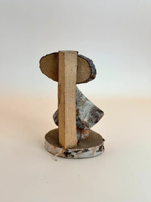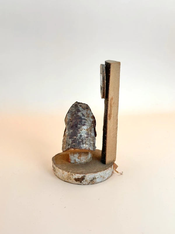 Une kokeshi traditionnelle vintage est un souvenir nostalgique de la Cinquième Station du Mont Fuji (富士山五合目), un point symbolique et spirituel situé à mi-hauteur de la montagne la plus vénérée du Japon. Fabriquée avec soin à la main en bois aux textures d'écorce naturelle, cette pièce représente une petite poupée kokeshi nichée dans une hutte conique. La poupée porte un bavoir protecteur rouge, rappelant les statues Jizō souvent présentes le long des chemins de pèlerinage, censées protéger les voyageurs et les enfants.
