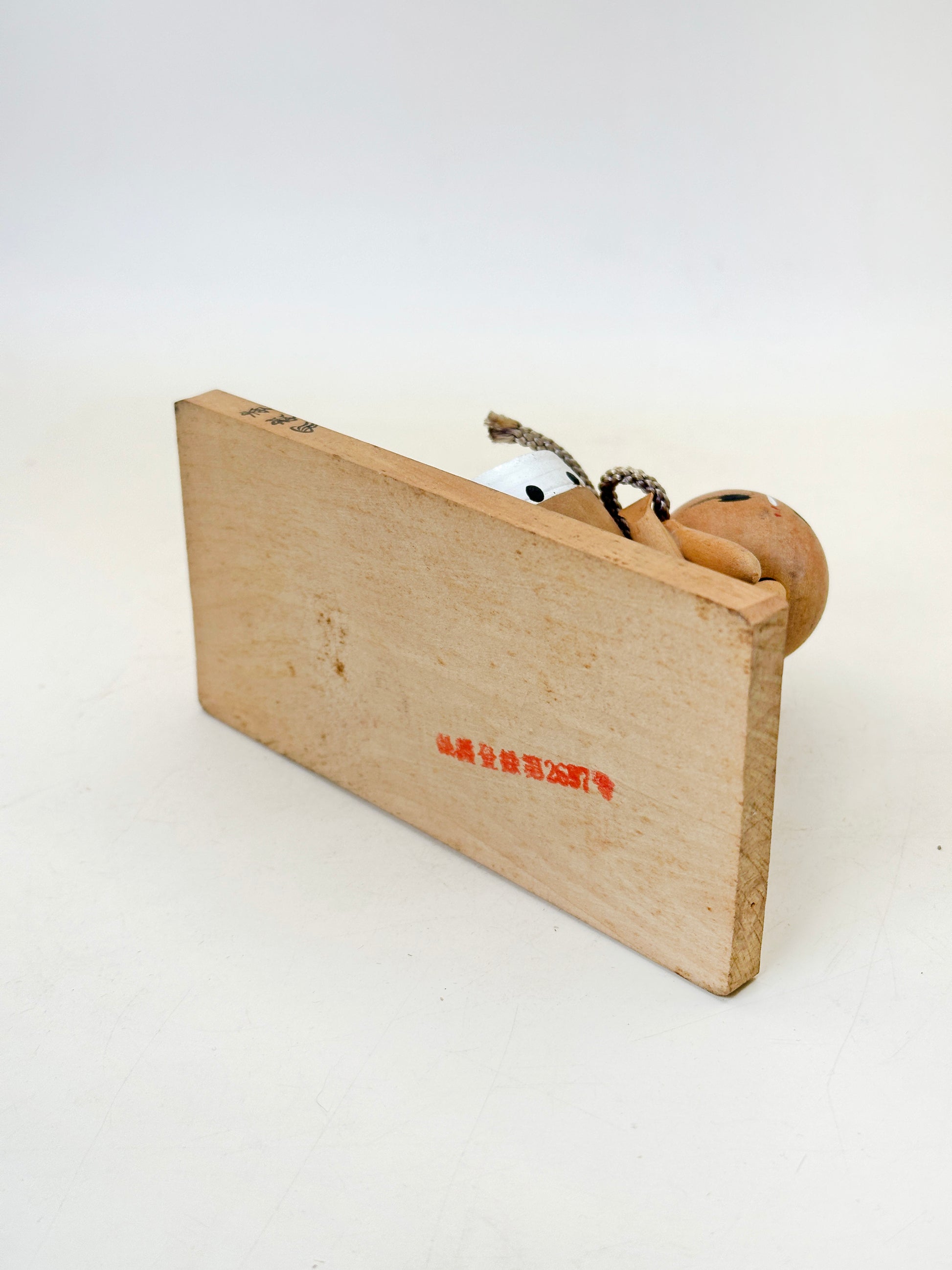 Unlike traditional upright kokeshi, this piece takes on a narrative, sculptural form. The small figure is shown seated, gently leaning against a hand drum (taiko) tied with a braided cord. With its head resting softly against the drum and eyes half-closed, the figure conveys a sense of quiet rest—perhaps after play, music, or a festival performance. This intimate pose gives the work a warm, human quality.
