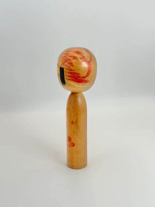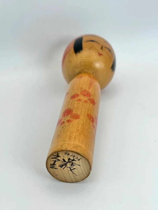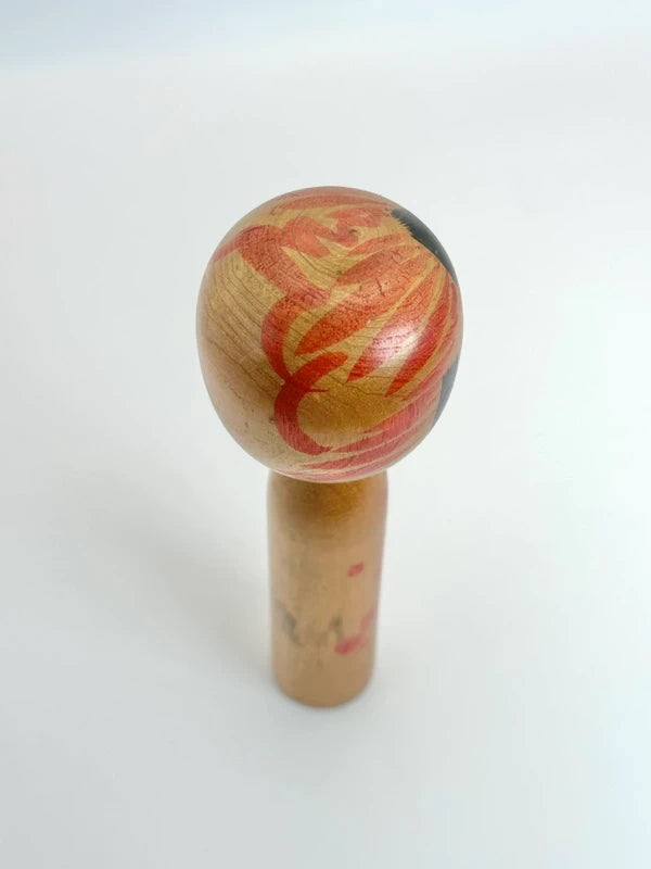 Une kokeshi Togatta vintage de Mamoru Sato (佐藤護, 1903–1979) est une représentation classique de l'esthétique traditionnelle de la lignée Togatta. Sa forme cylindrique élancée est associée à une tête ronde légèrement surdimensionnée, lui conférant une allure à la fois posée et ludique.