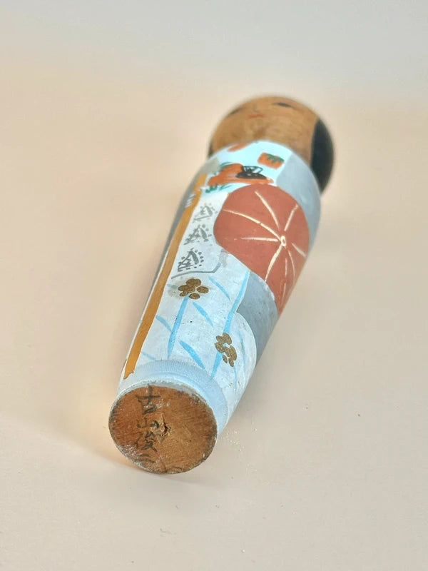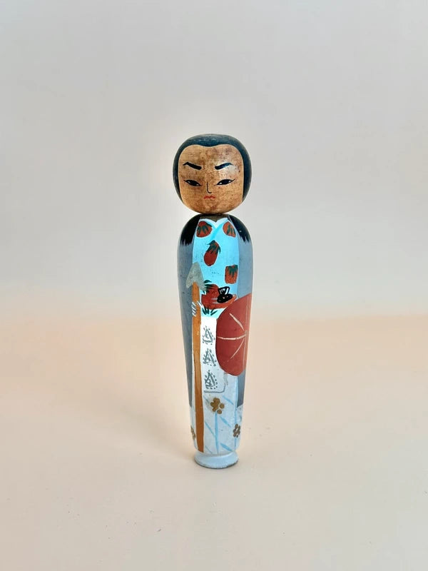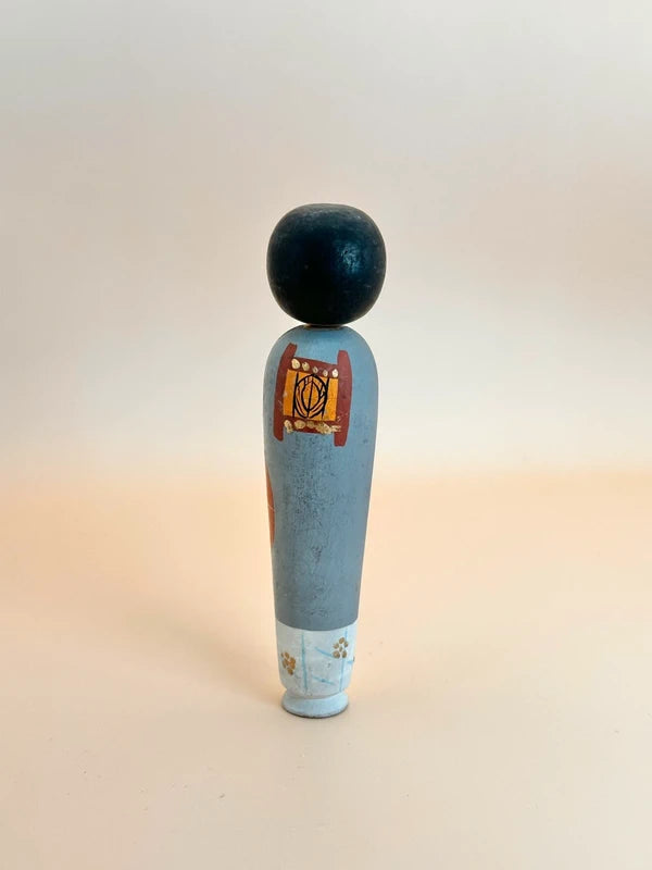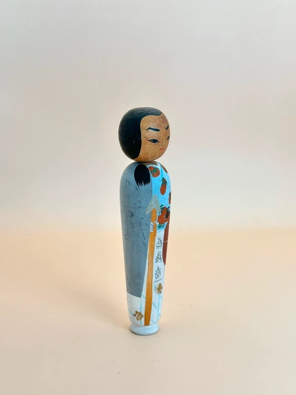 Une kokeshi sōsaku vintage et évocatrice de l'artiste Shunji Furuyama (古山俊二) se distingue par son motif détaillé peint à la main et la représentation expressive de ses personnages. La figurine semble vêtue de la tenue distinctive des Yamabushi (山伏), moines ascétiques des montagnes de la tradition Shugendō, connus pour leur formation spirituelle et leurs rituels dans les montagnes sacrées du Japon.