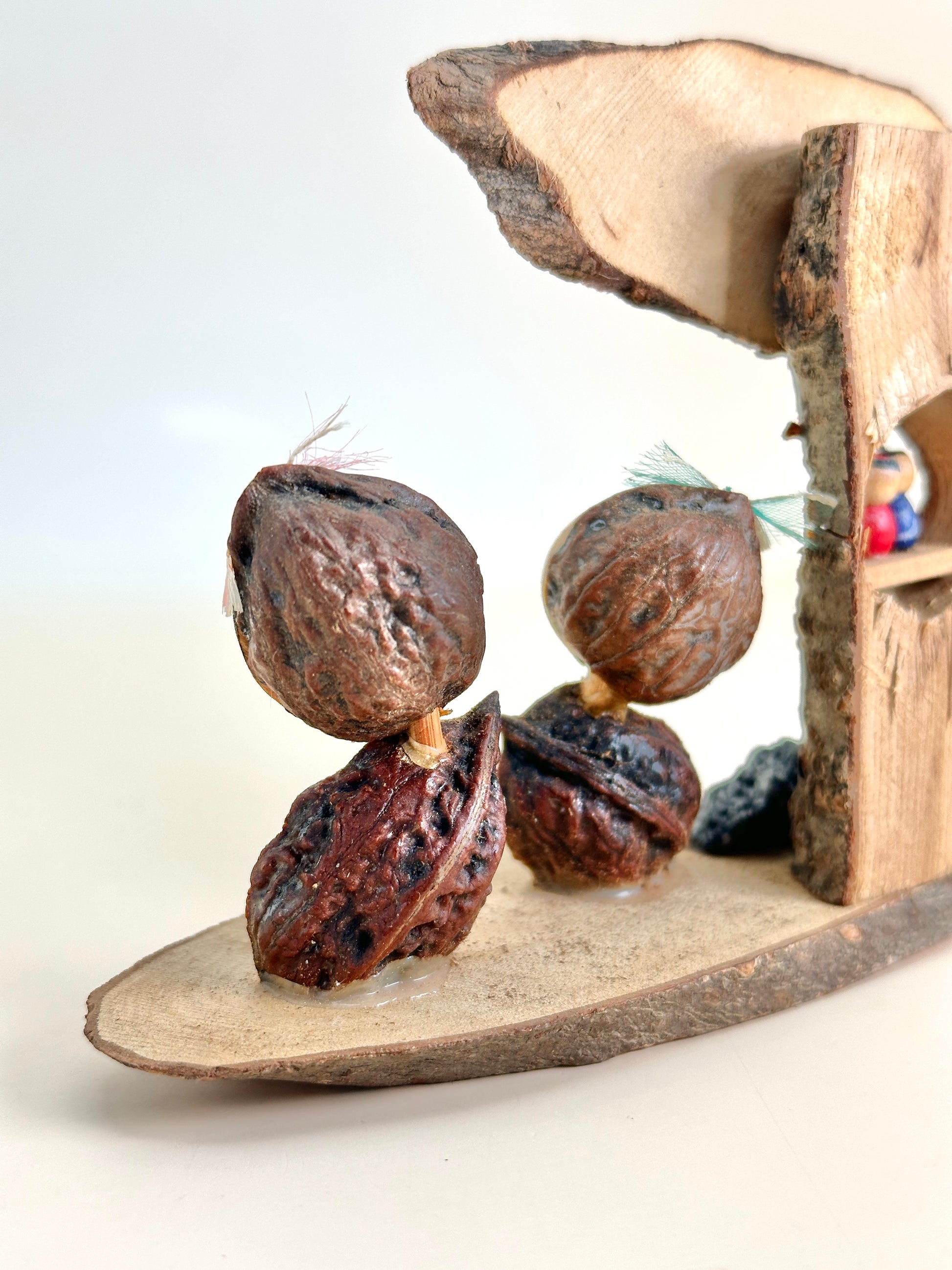 This omiyage kokeshi set titled「お山の子」(Oyama no Ko – “Children of the Mountain”) captures the warmth of rural childhood life in the mountains of Japan. Crafted from natural materials including raw wood slices and walnut shells, the set features two adorable hand-painted kokeshi children with walnut shell bodies and feather-like accents for hair, giving each figure a distinct personality.