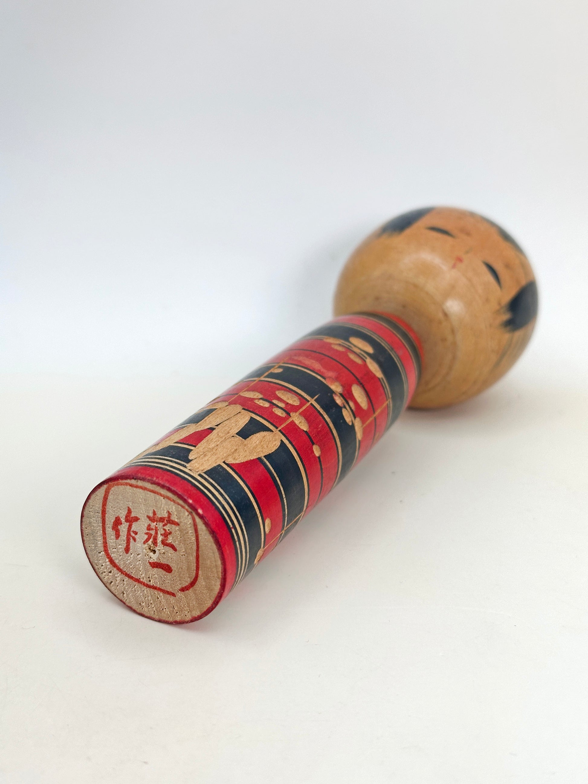 This shingata (new-style) kokeshi by Shōichi (莊一) exemplifies the charm of early creative kokeshi design, blending simplicity with bold artistry. The doll features a classic rounded head with softly shaded hair and expressive, almond-shaped eyes—an understated facial expression that conveys quiet calmness, a hallmark of many mid-century shingata works.