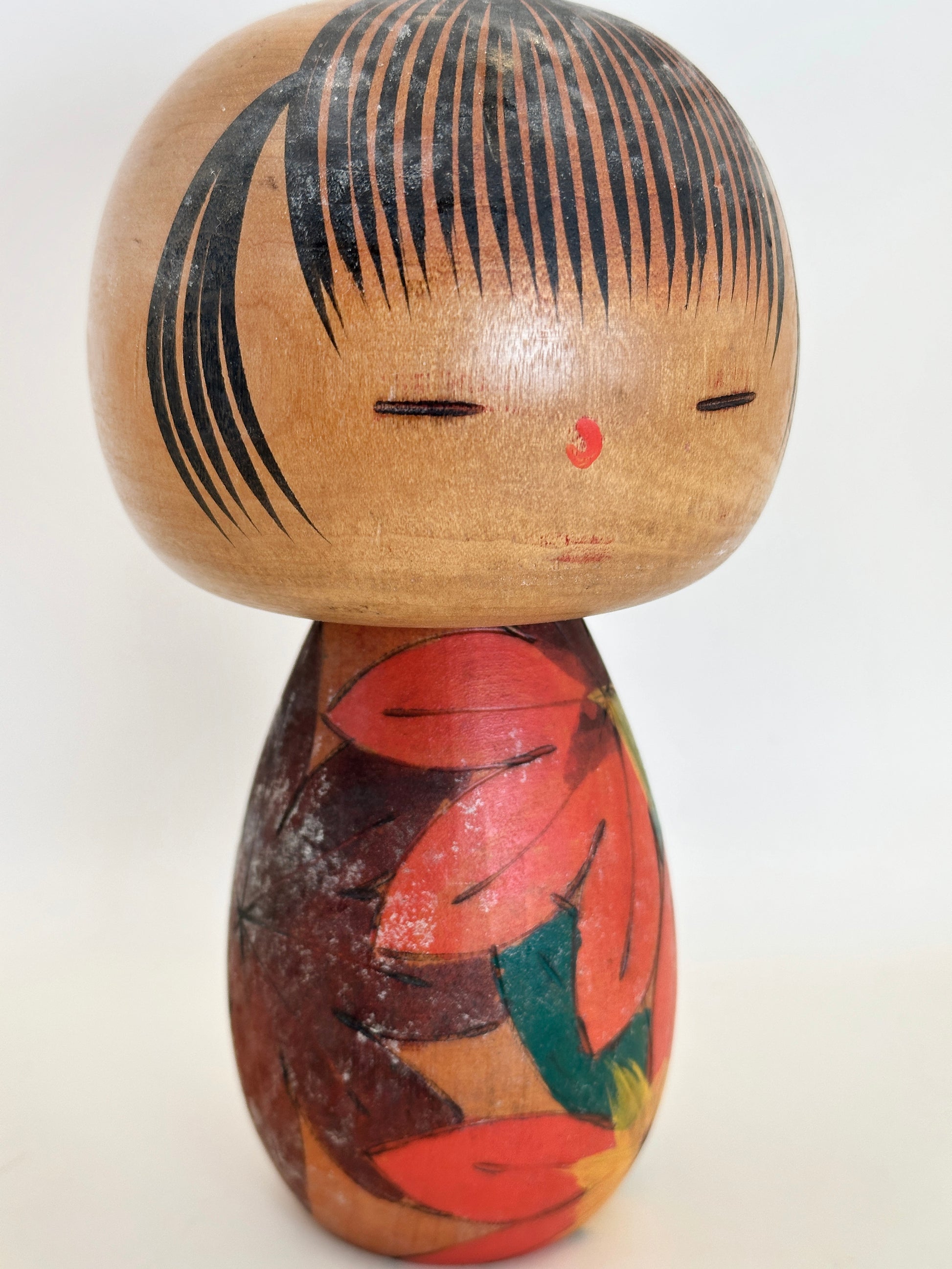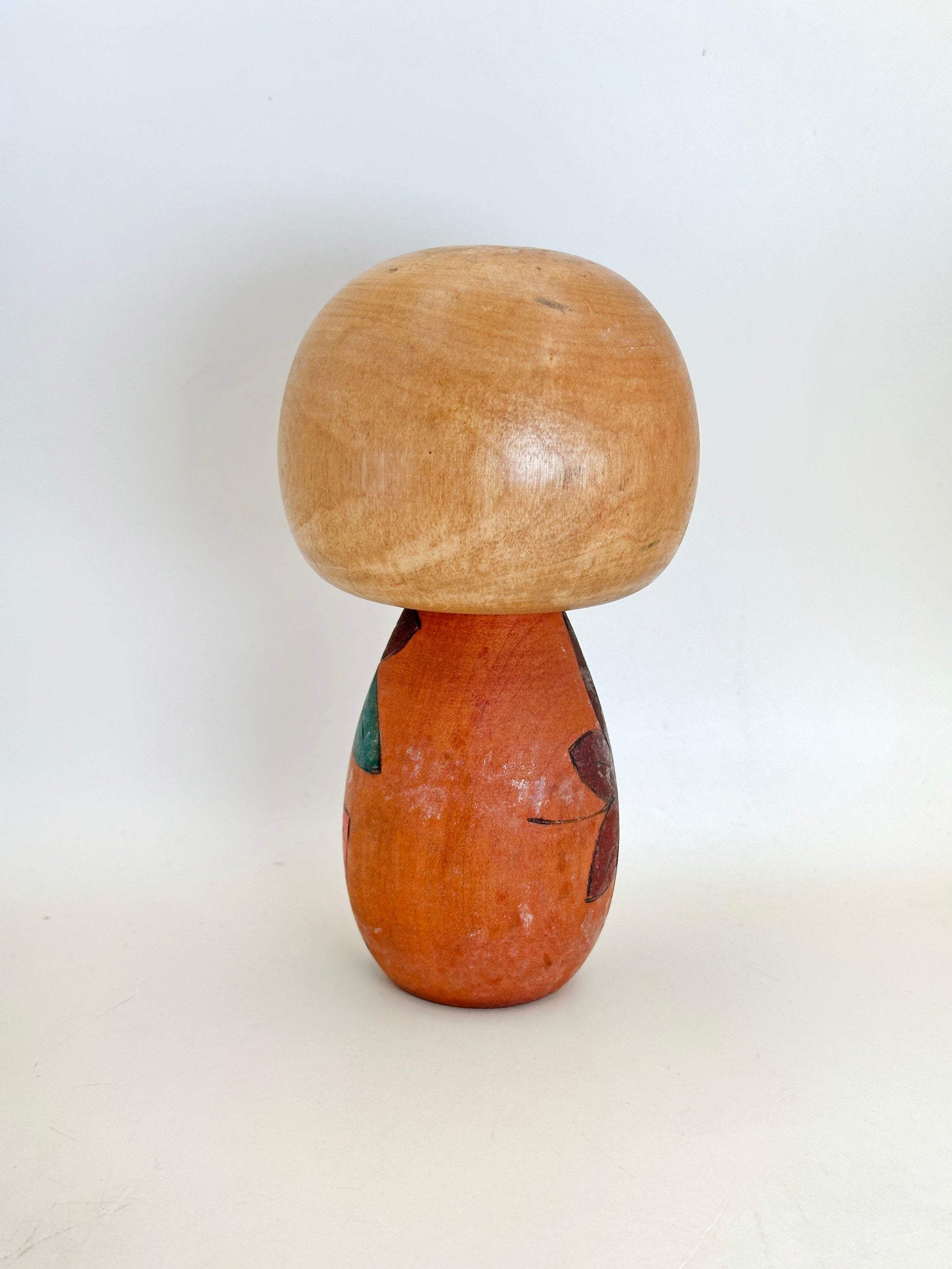 The silhouette is soft and rounded, with smooth curves and a balanced weightiness, reflecting Kawase’s background in traditional woodworking from Gunma Prefecture. Despite the simplicity of the carving, the figure carries a distinctly tender personality, typical of the understated charm found in Kawase’s dolls from the 1960s–1980s.