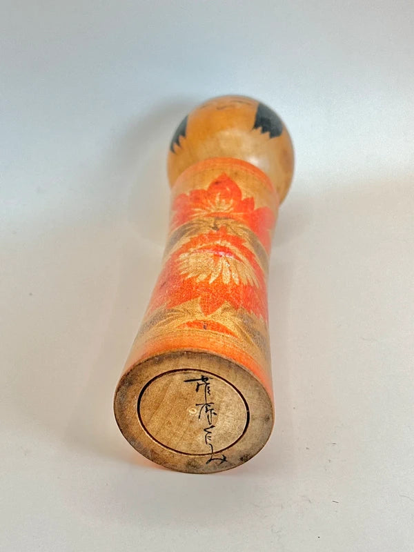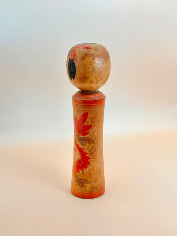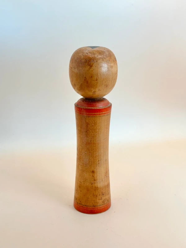 Une poupée kokeshi Naruko de l'artisan Kunimi Sugawara (菅原くにみ, 1948–2003) Fidèle à la tradition Naruko, la poupée présente un corps cylindrique, une tête ronde et un anneau décoratif rouge distinctif au niveau du cou, caractéristiques de ce style.