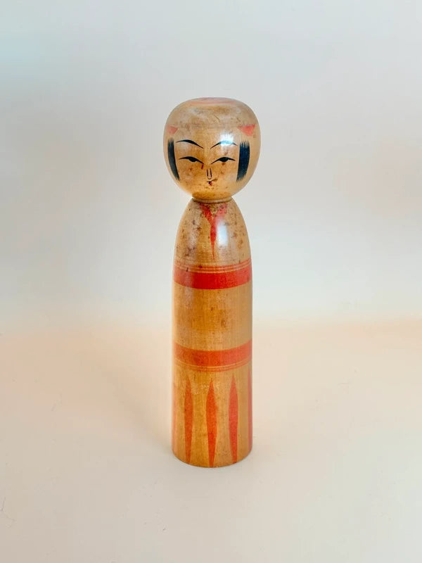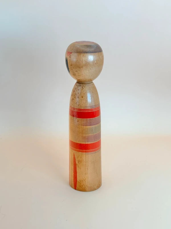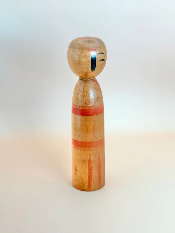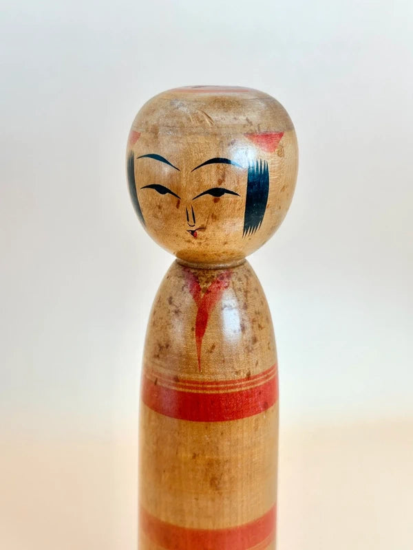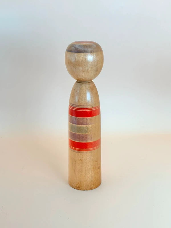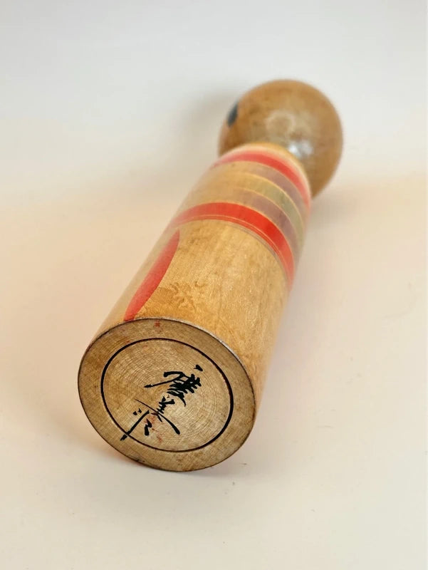 Une kokeshi traditionnelle de style Yajirō, réalisée par Keimi Niiyama (新山慶美, 1925–2003), maître artisan de Shiroishi, dans la préfecture de Miyagi. Cette kokeshi est une parfaite illustration de l'esthétique classique Yajirō, caractérisée par ses lignes épurées, sa beauté minimaliste et son design symétrique.