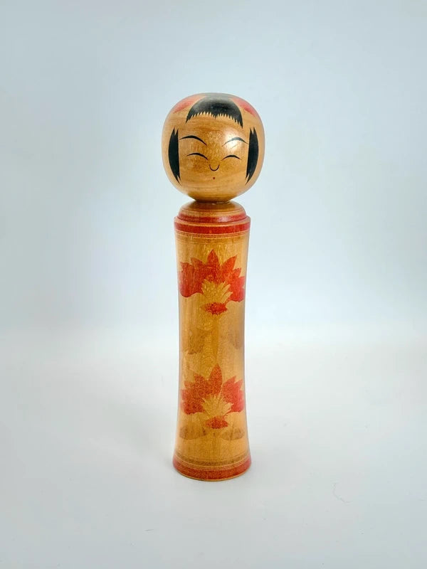 La poupée présente une tête ronde et un corps élancé, légèrement évasé. Son visage serein est peint d'une expression douce – sourcils arqués, yeux en demi-lune et sourire subtil – le tout encadré par des cheveux stylisés aux traits noirs audacieux. Le corps est orné des motifs floraux caractéristiques de Yusa, semblables à des chrysanthèmes, dans des tons rouges doux, gracieusement répétés verticalement. La finition générale du bois est polie avec soin, laissant apparaître le veinage, lui conférant texture et chaleur.