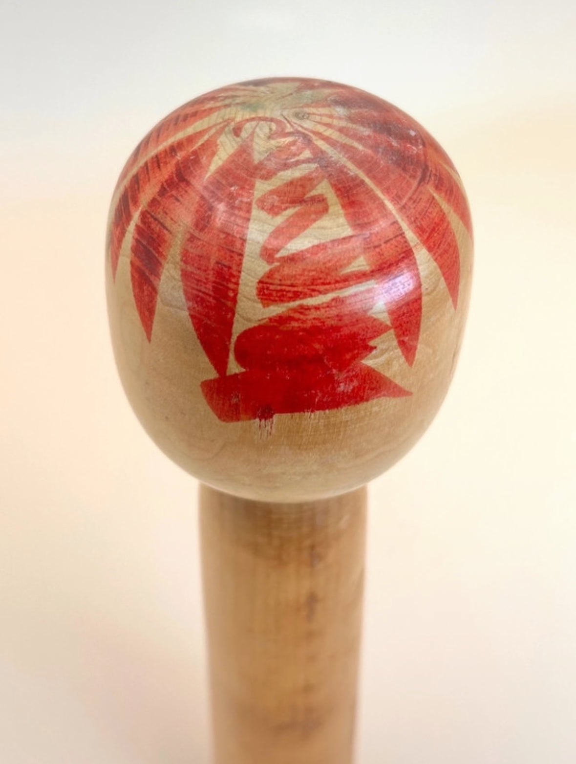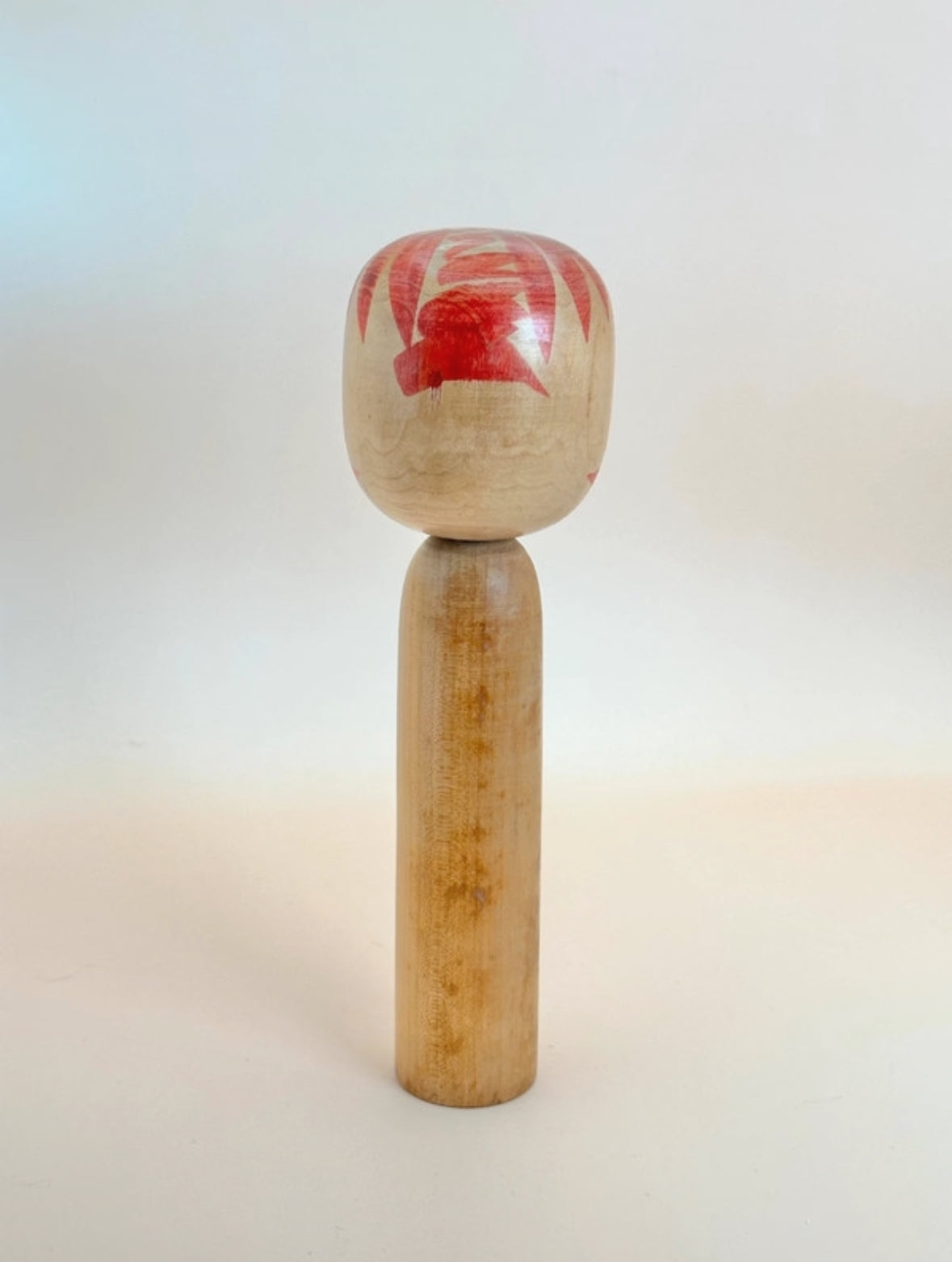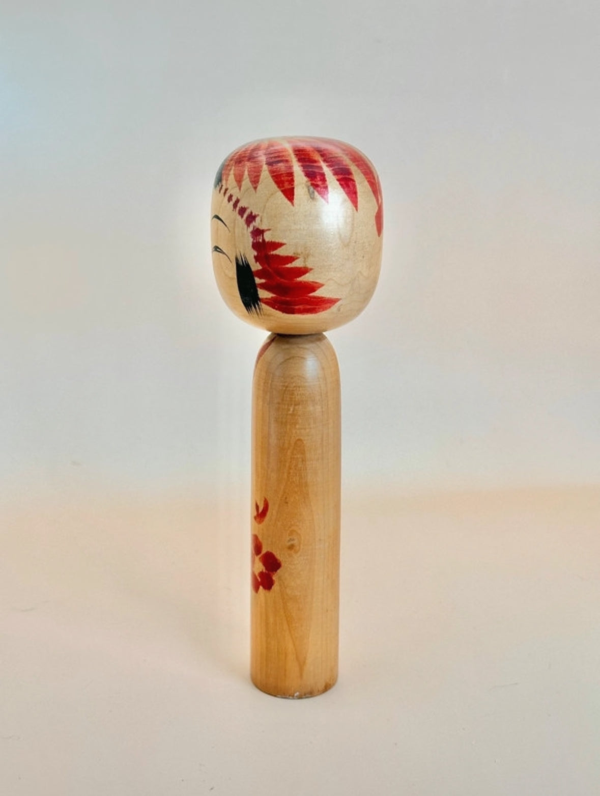 La poupée présente un corps cylindrique et une tête légèrement arrondie, peinte d'une expression sereine : des sourcils finement arqués, des yeux en croissant et une bouche subtilement rouge. La tête est ornée de larges coups de pinceau radiaux rouges, suggérant un motif floral ou une couronne, élément caractéristique de nombreuses poupées Togatta.