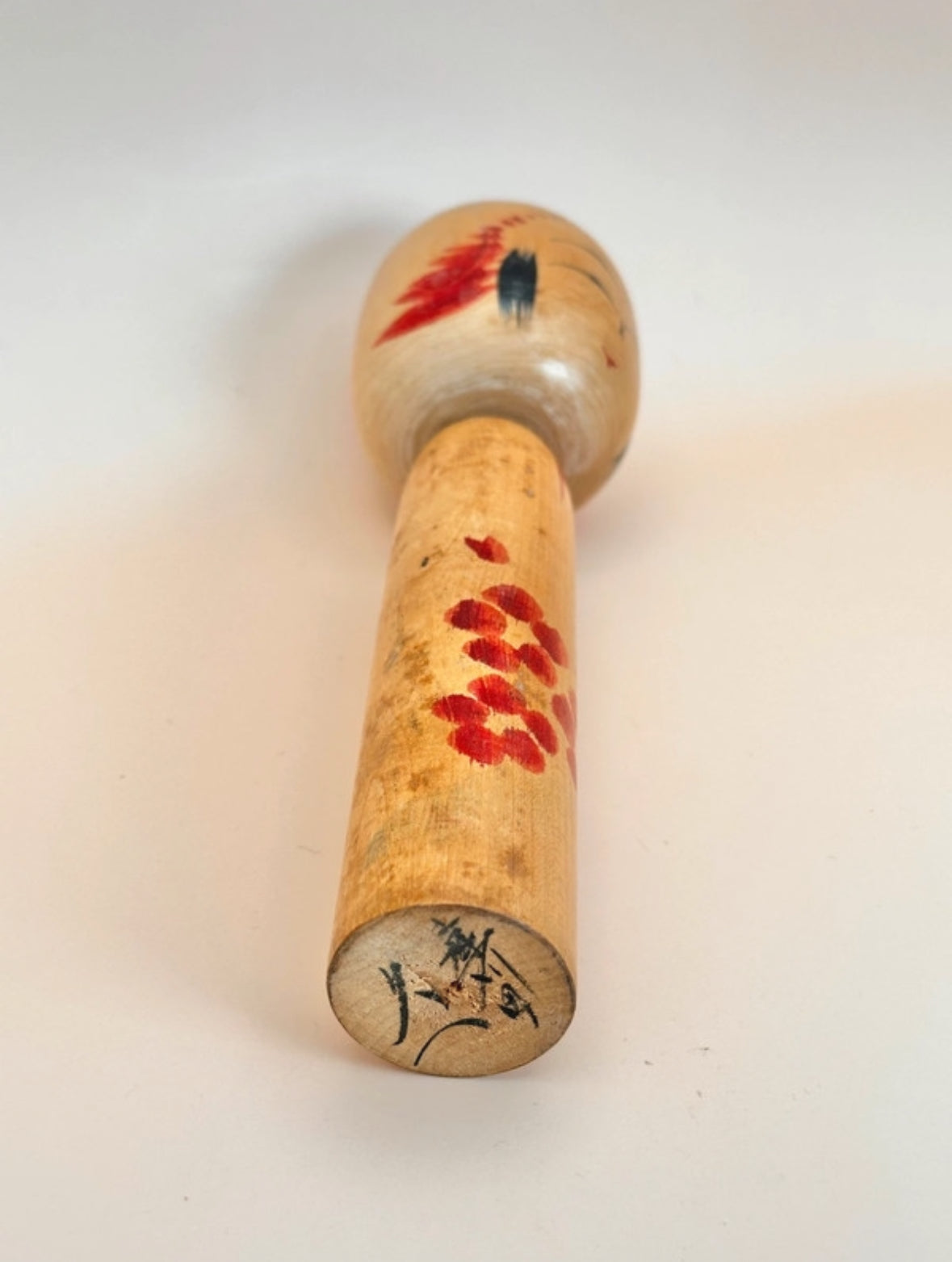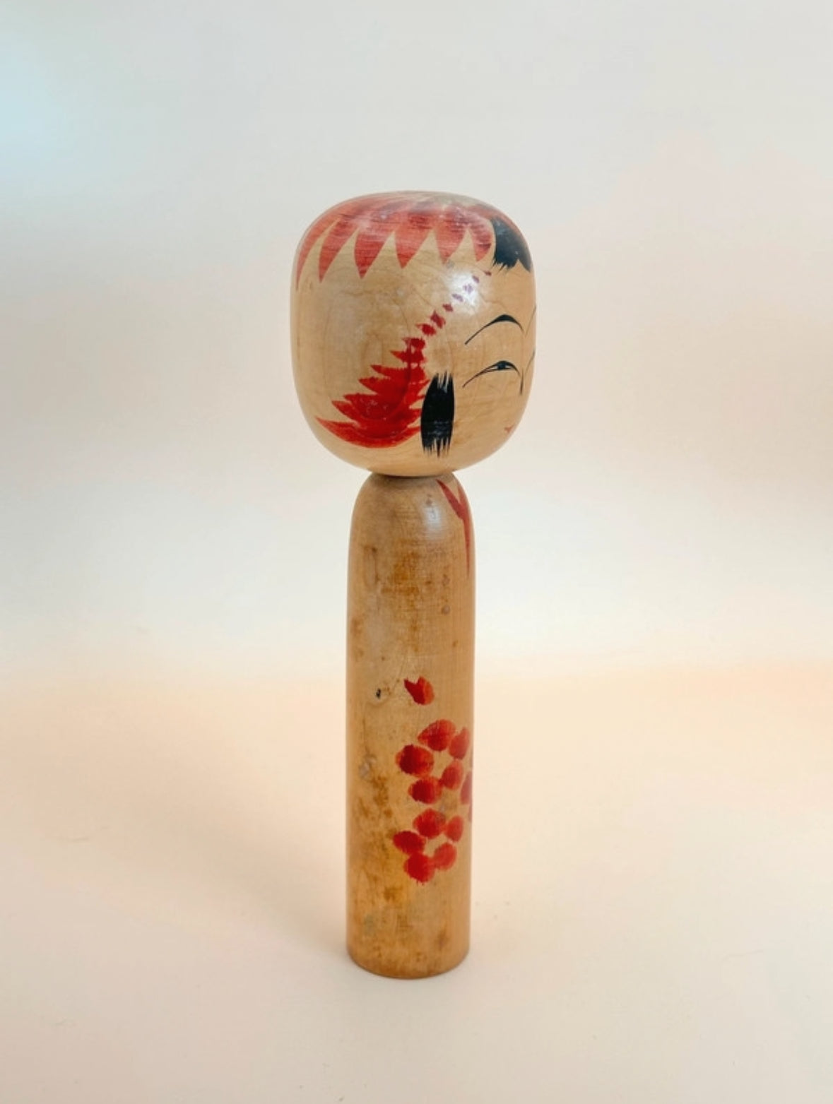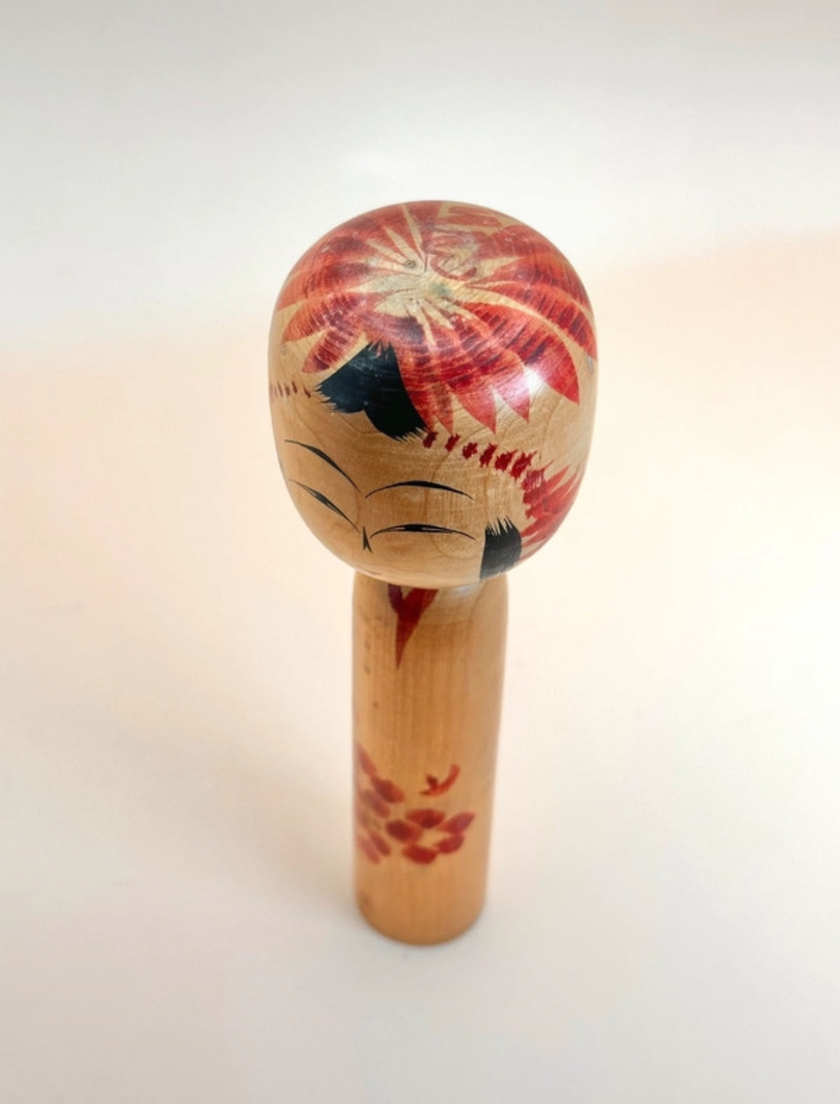 La poupée présente un corps cylindrique et une tête légèrement arrondie, peinte d'une expression sereine : des sourcils finement arqués, des yeux en croissant et une bouche subtilement rouge. La tête est ornée de larges coups de pinceau radiaux rouges, suggérant un motif floral ou une couronne, élément caractéristique de nombreuses poupées Togatta.