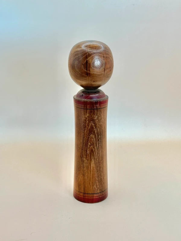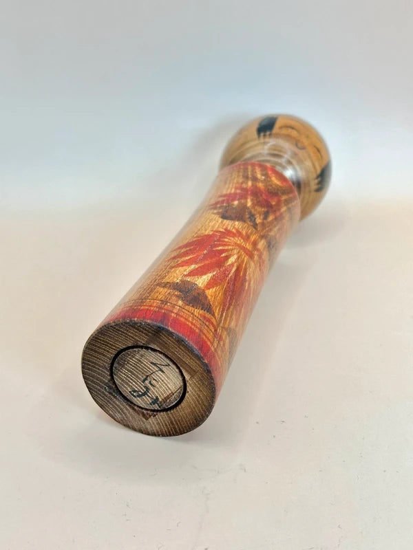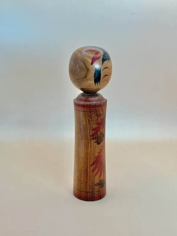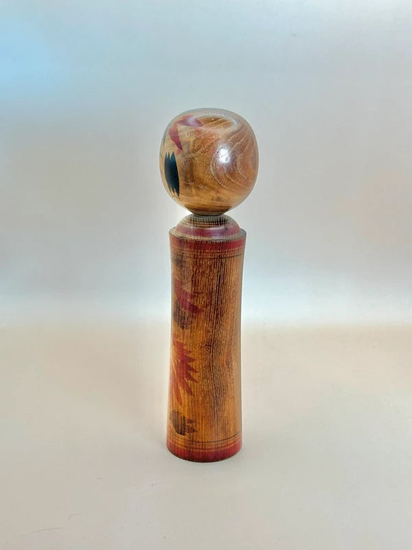 Une poupée kokeshi Naruko de l'artisan Kunimi Sugawara (菅原くにみ, 1948–2003) Fidèle à la tradition Naruko, la poupée présente un corps cylindrique, une tête ronde et un anneau décoratif rouge distinctif au niveau du cou, caractéristiques de ce style.
