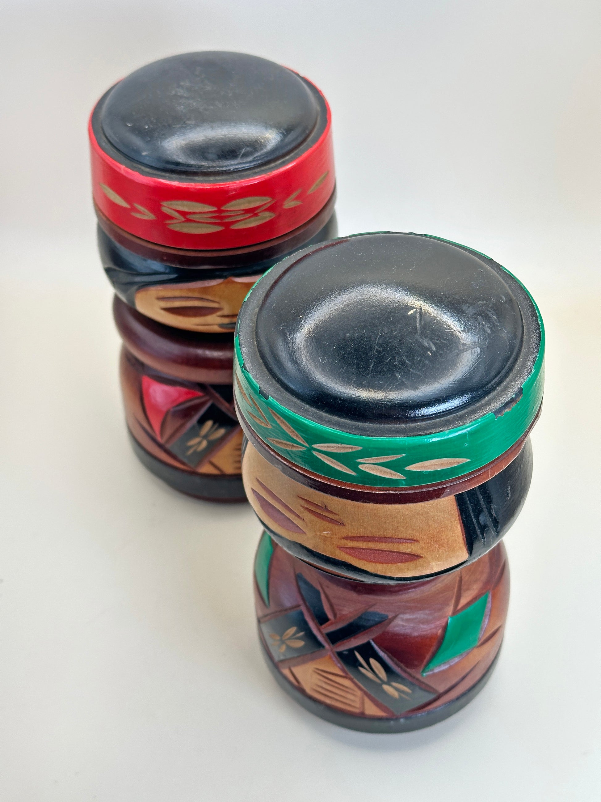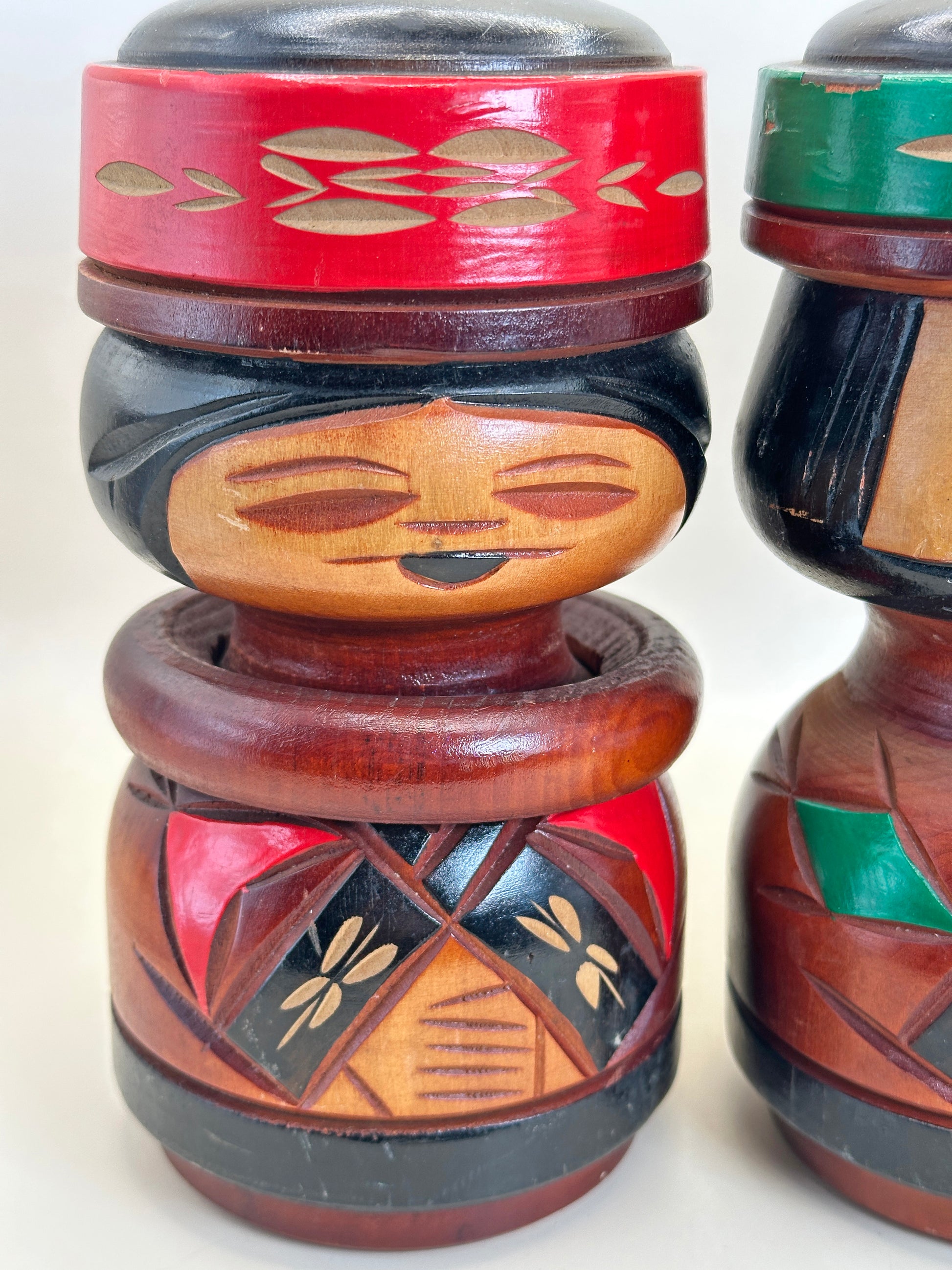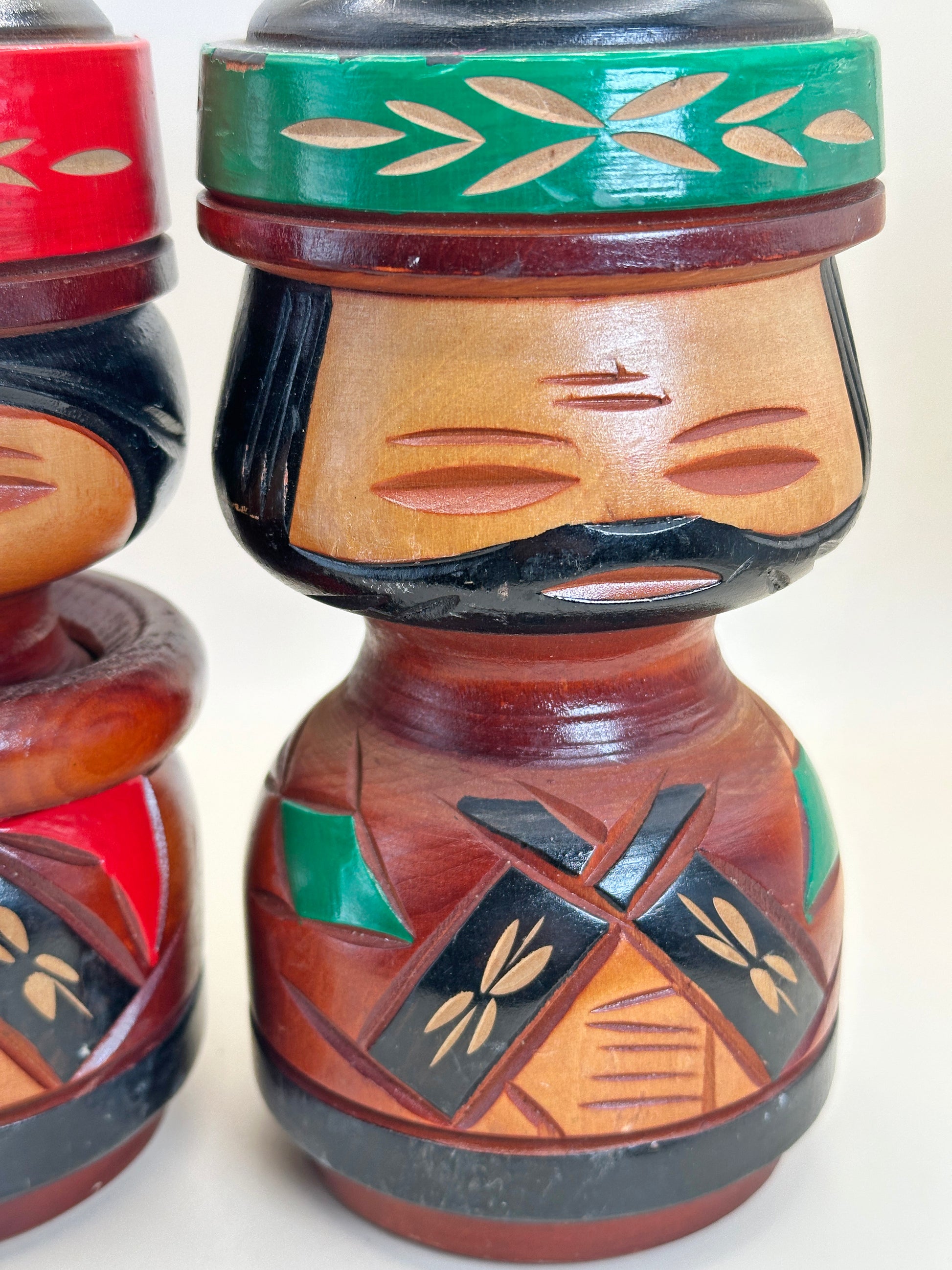Les corps arrondis des poupées sont richement ornés de motifs géométriques et végétaux, finement incisés et peints dans des tons profonds de rouge, de vert, de noir et de bois naturel. Ces motifs font écho aux dessins traditionnels aïnous associés à la protection, à la vitalité et au lien avec la nature. Les motifs en forme de libellule et les bandes angulaires des vêtements évoquent le symbolisme ancestral et les motifs textiles, tandis que les larges cols et les chapeaux confèrent aux figurines une présence digne et cérémonielle.