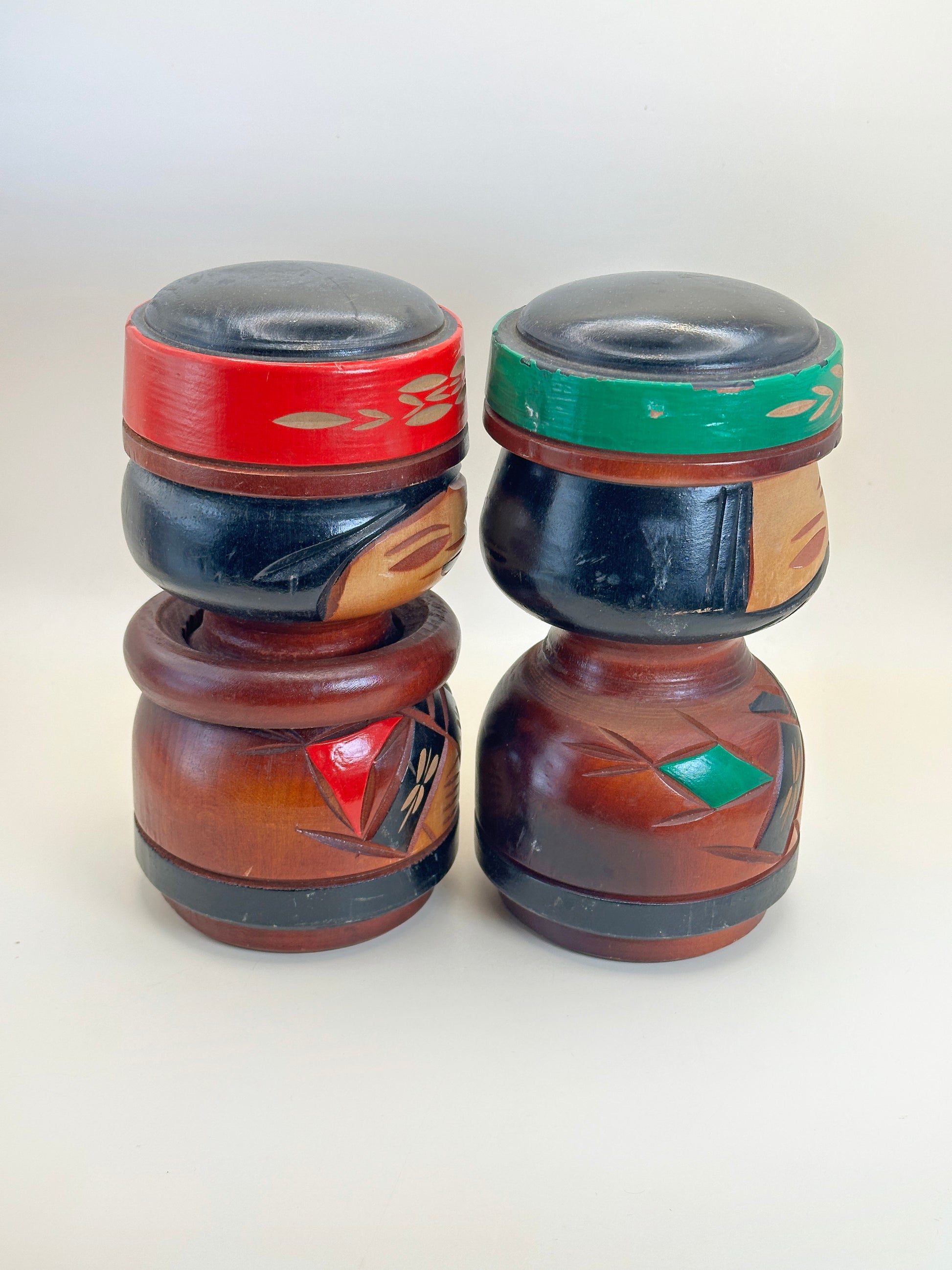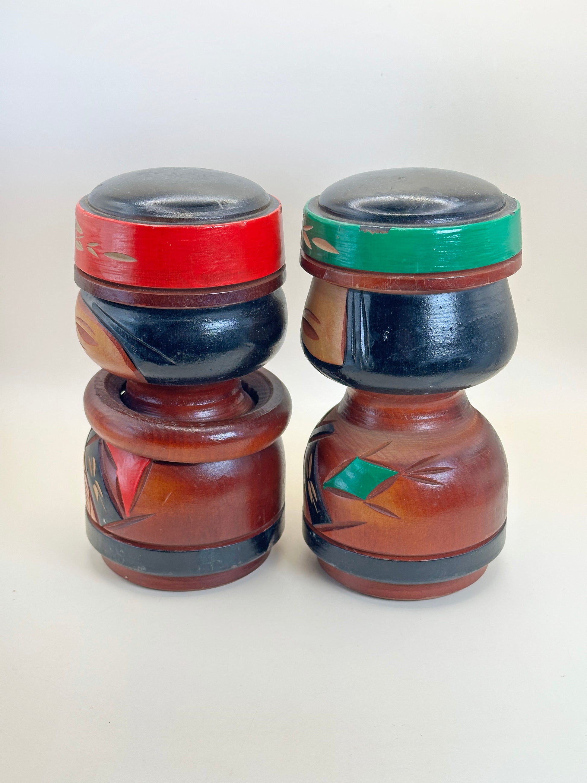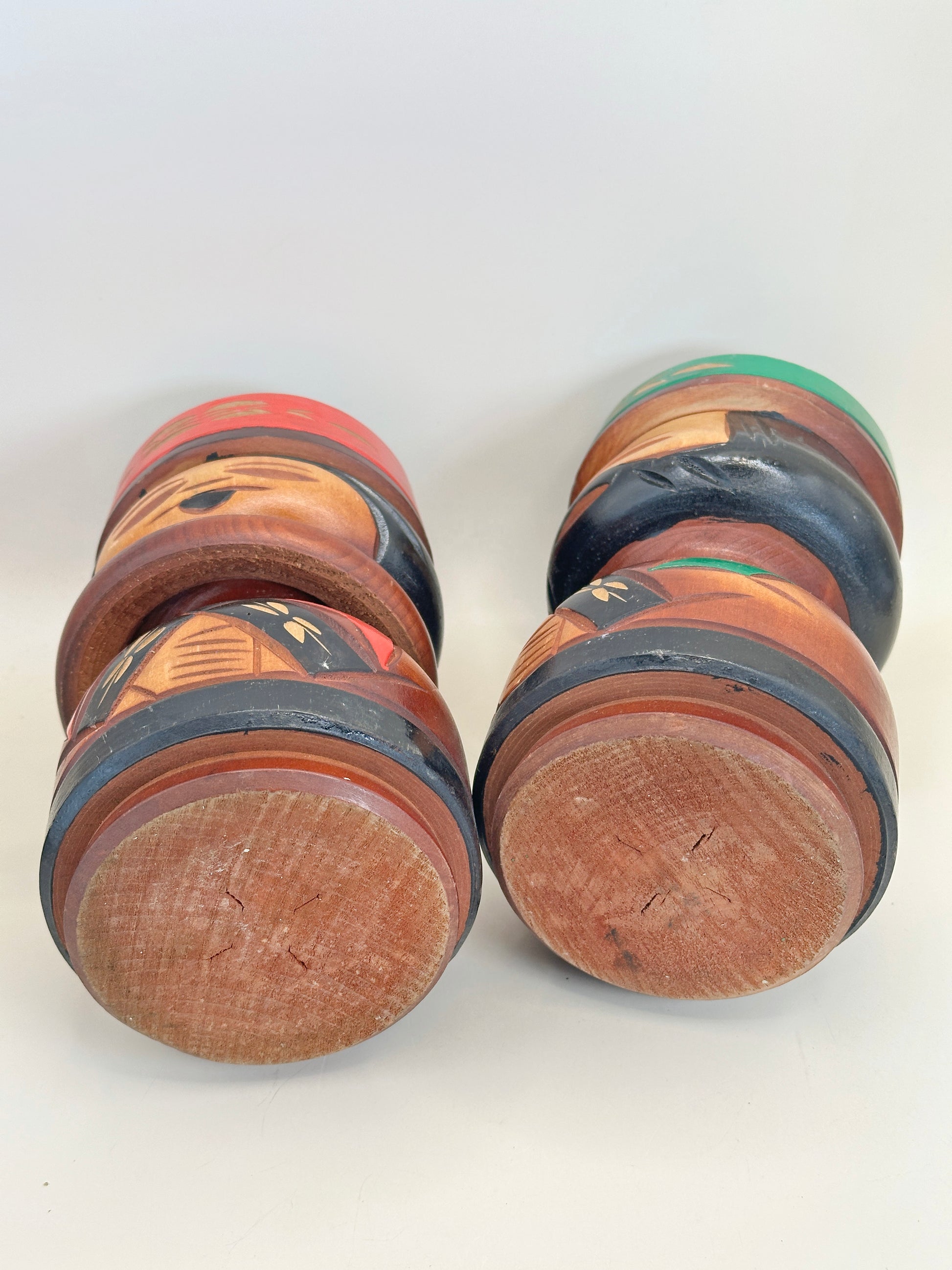 Les corps arrondis des poupées sont richement ornés de motifs géométriques et végétaux, finement incisés et peints dans des tons profonds de rouge, de vert, de noir et de bois naturel. Ces motifs font écho aux dessins traditionnels aïnous associés à la protection, à la vitalité et au lien avec la nature. Les motifs en forme de libellule et les bandes angulaires des vêtements évoquent le symbolisme ancestral et les motifs textiles, tandis que les larges cols et les chapeaux confèrent aux figurines une présence digne et cérémonielle.