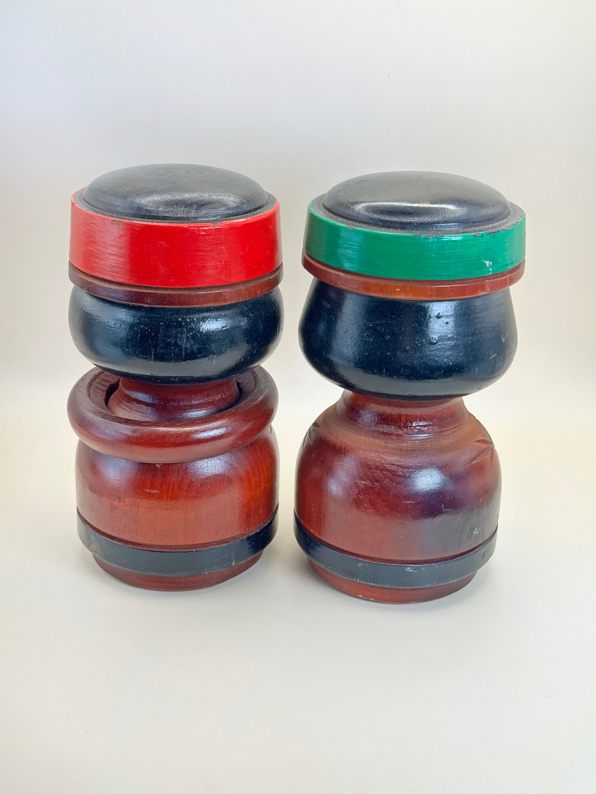 Cette paire de poupées Ainu Nipopo (ニポポ人形) de style Sōsaku Kokeshi incarne la force, la chaleur et le symbolisme culturel des traditions de sculpture sur bois Ainu, tout en les présentant sous une forme sculpturale compacte. Sculptées dans le bois et finies avec des pigments riches et naturels, les figurines représentent un couple, homme et femme, identifiables par de subtiles différences dans la pilosité faciale et des accents de couleur, soulignant l'harmonie et la camaraderie.