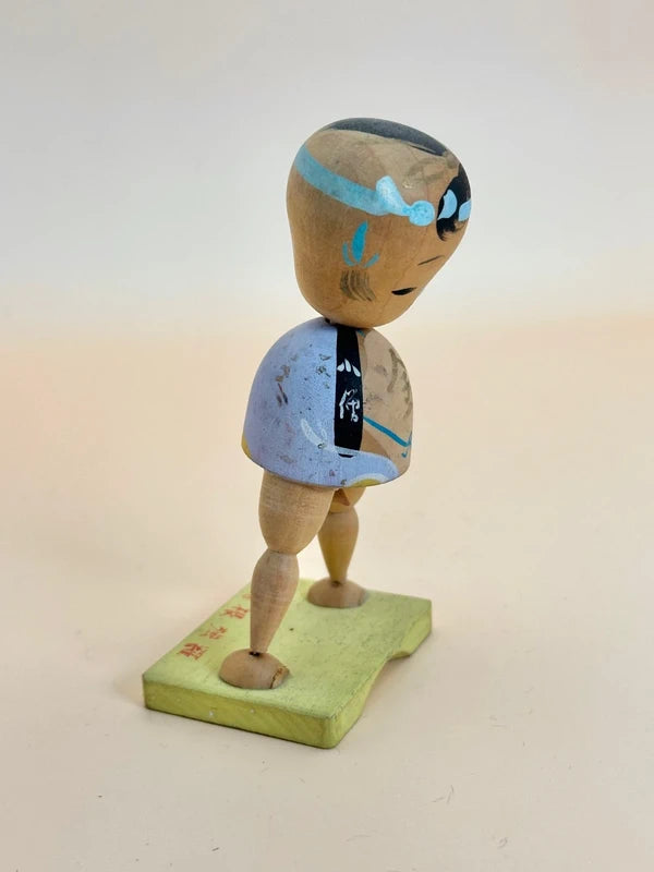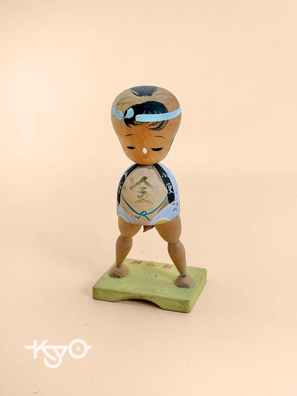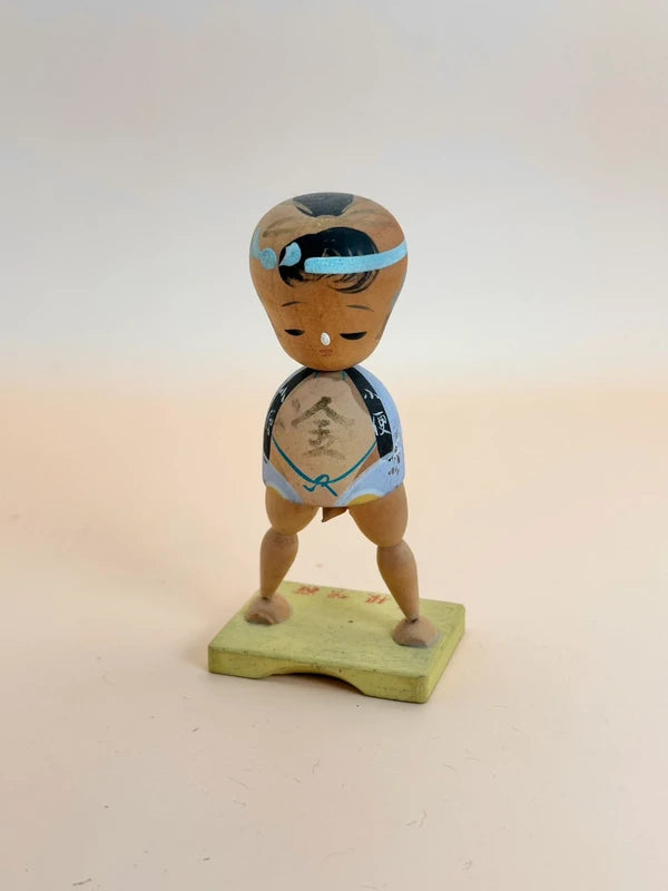 Vêtu d'une tenue de style fundoshi, il porte un tablier haragake peint portant le kanji « 金 » (or). Ses membres arrondis et son visage expressif sont délicatement peints à la main, tandis que des touches de bleu sur son bandeau et ses manches lui confèrent un charme doux et enfantin. La figurine est fixée sur un socle vert clair portant l'inscription « 強羅 » (Gōra), soulignant son identité régionale.
