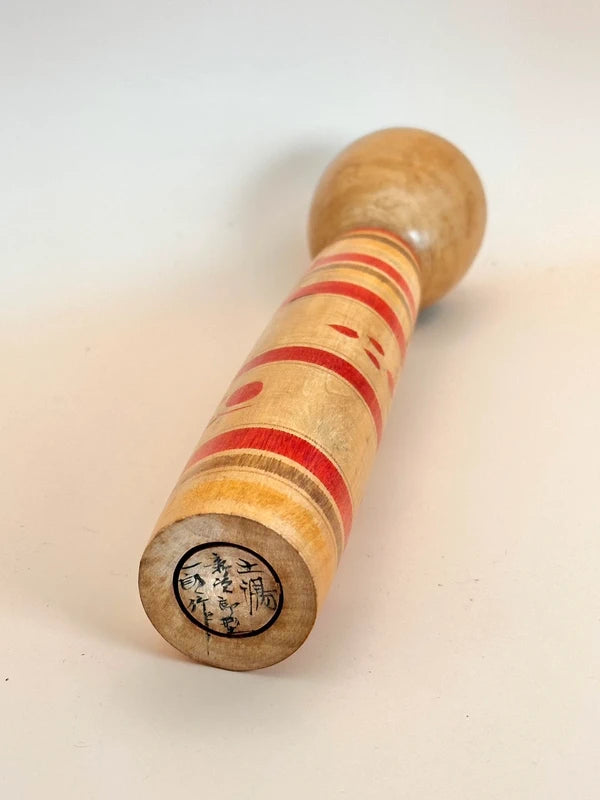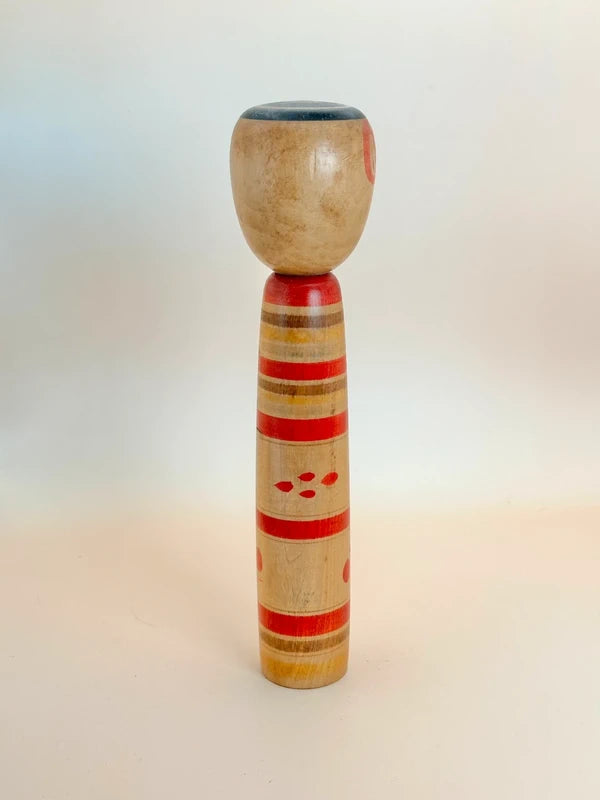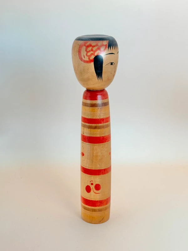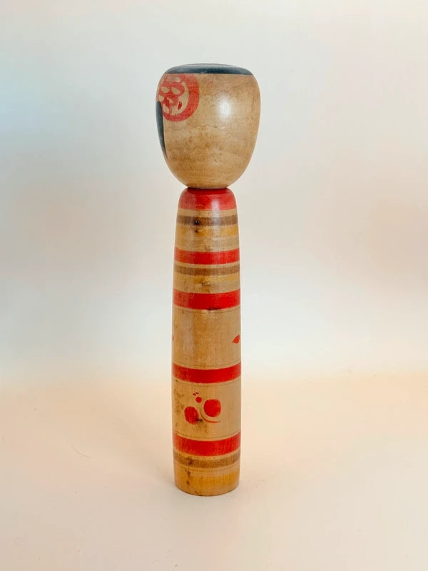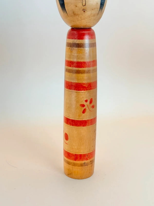 Le corps, gracieusement fuselé, est décoré de bandes traditionnelles rouges et brunes tournées au tour, un motif classique du style Tsuchiyu. Une petite touche florale rouge au milieu ajoute une touche artistique délicate. La finition légèrement rustique et les tons chauds confèrent à la poupée un caractère intemporel, évoquant l'esprit de l'artisanat japonais d'après-guerre.