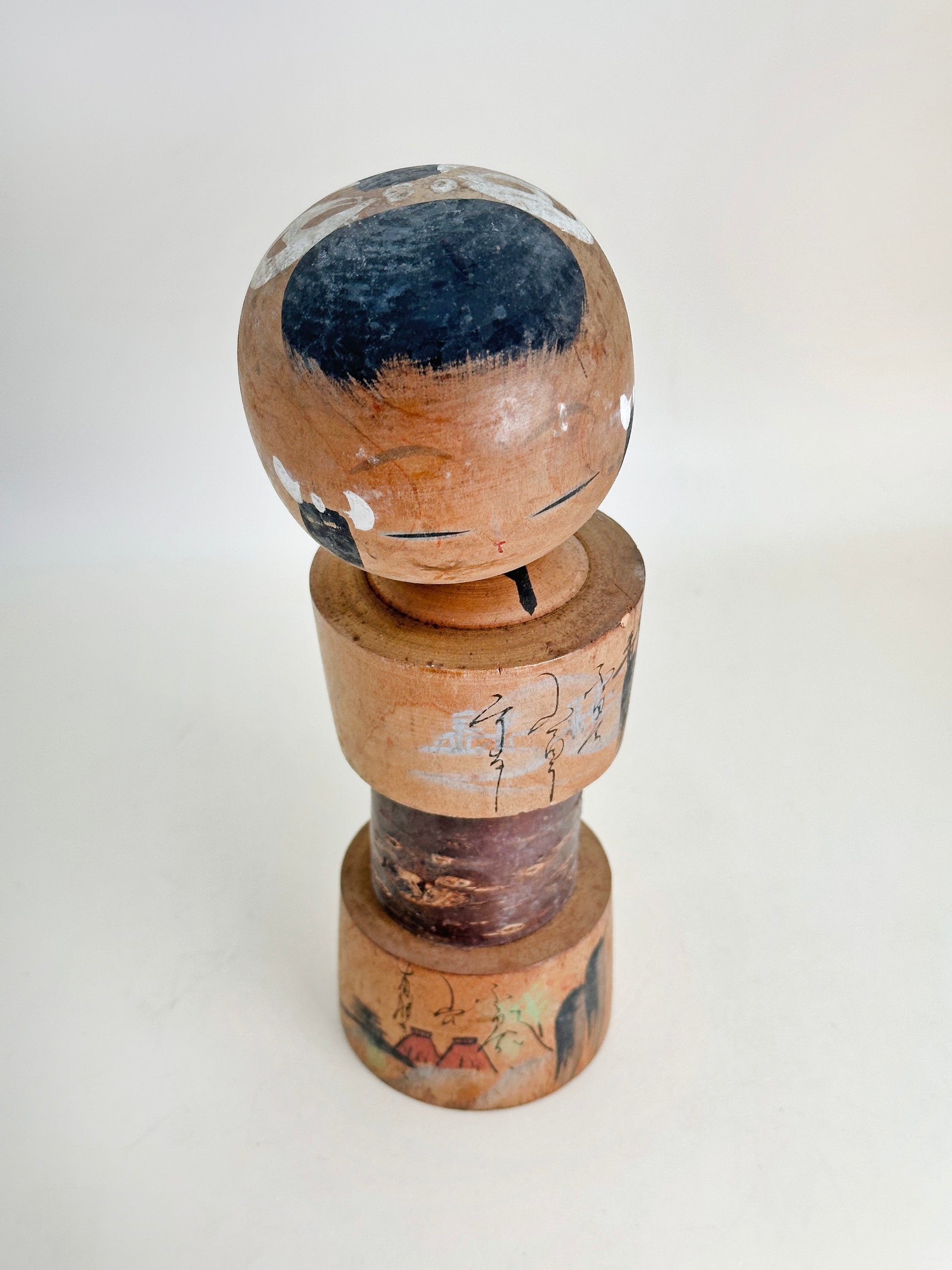 The body is adorned with calligraphy and a painterly depiction of Shirakawa-go’s rural scenery, including traditional houses and trees, rendered in earthy tones with hints of green and red. This type of kokeshi is a beautiful representation of the Showa-era souvenir culture, often sold in hot spring towns and tourist spots.